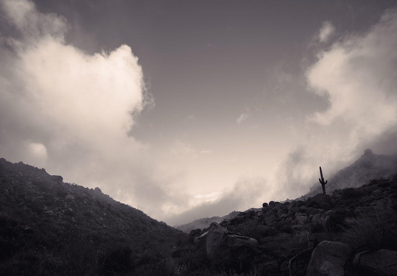 Sepia Saturday: Low clouds drift through a quiet valley as a storm clears in the Mazatzal Mountains.