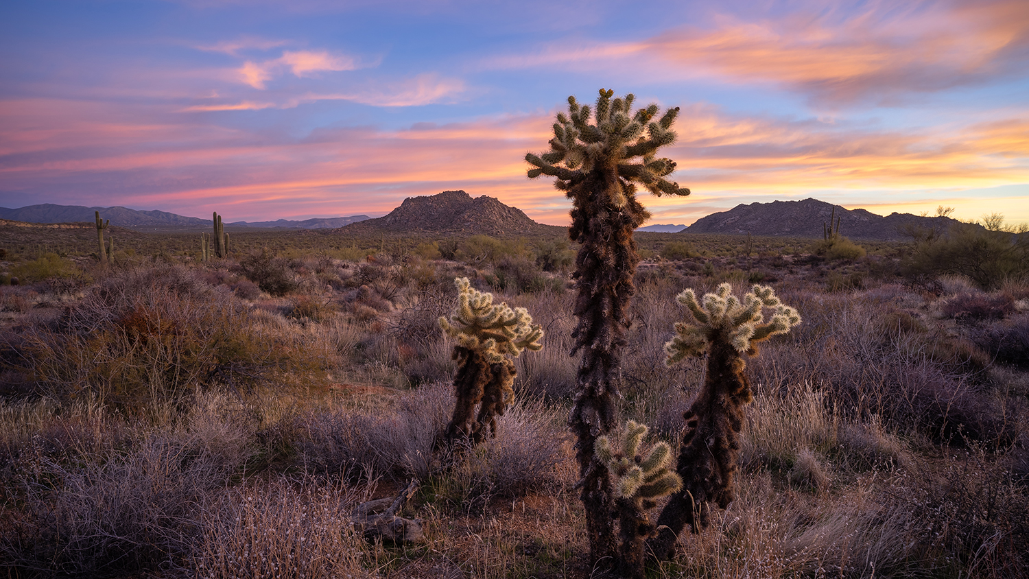 Teddy bear chollas watch over the McDowell Sonoran Preserve in Scottsdale just before sunrise.