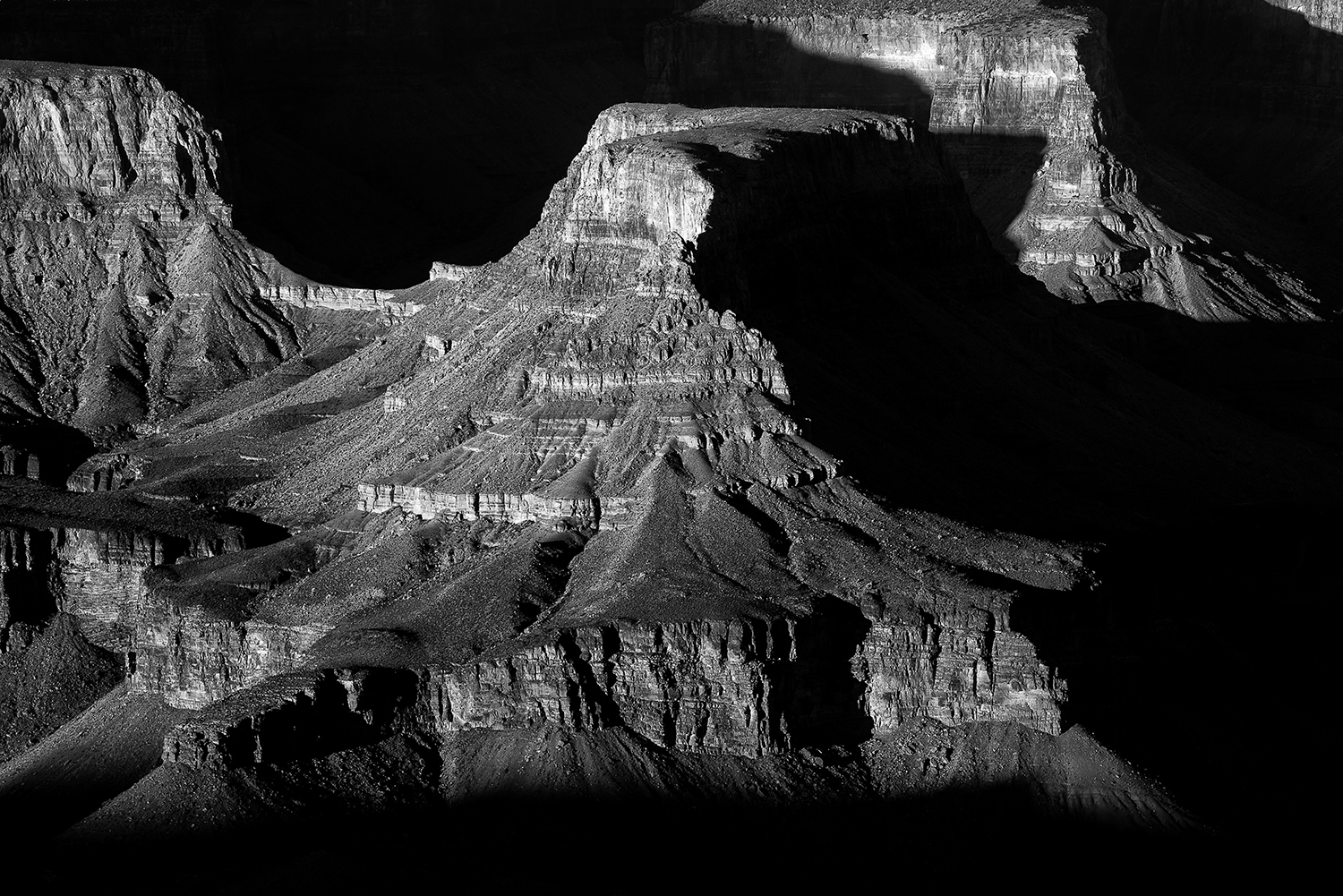 Black and White Wednesday: A winter sunset creates long shadows on formations in the Grand Canyon.