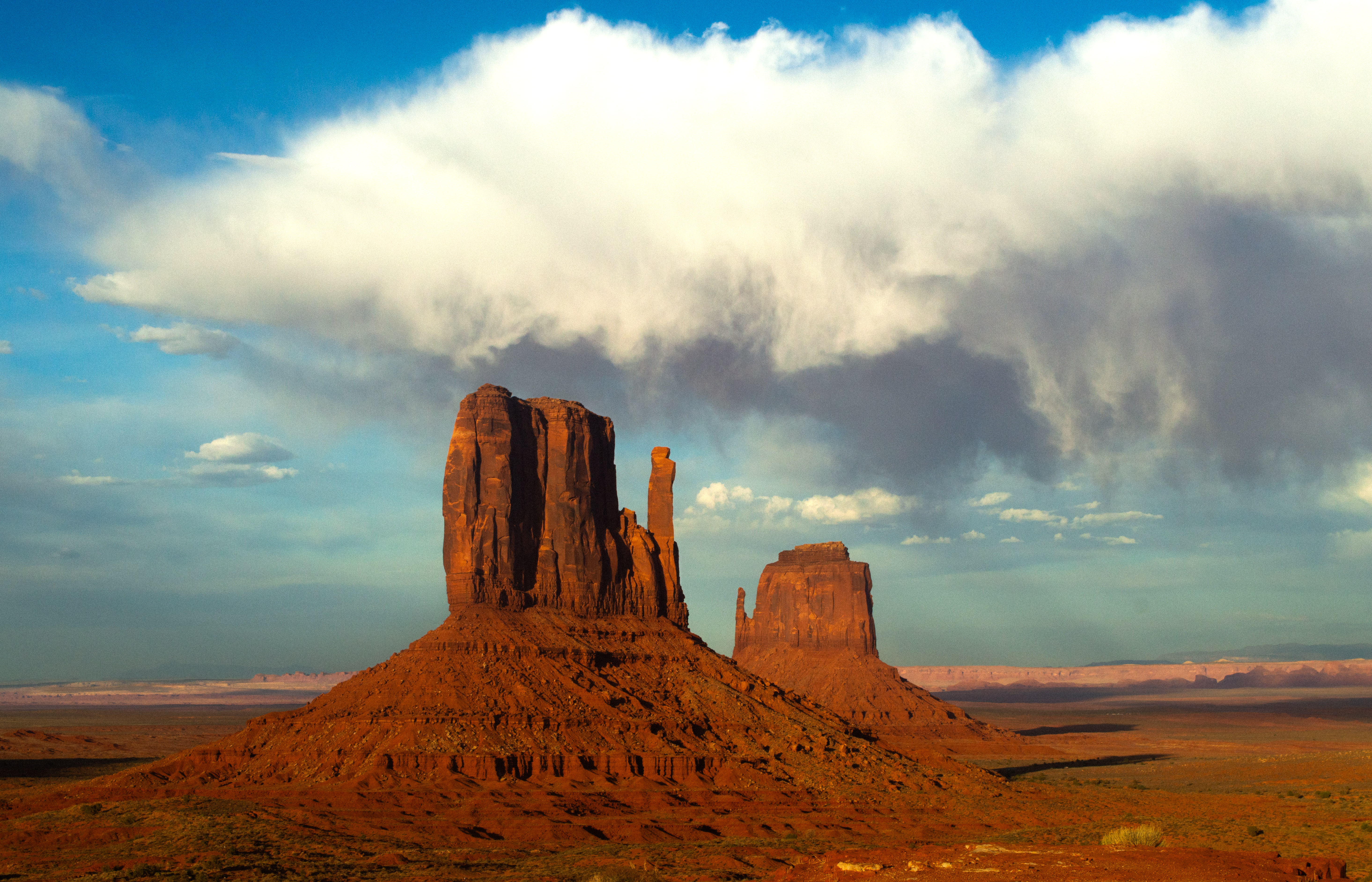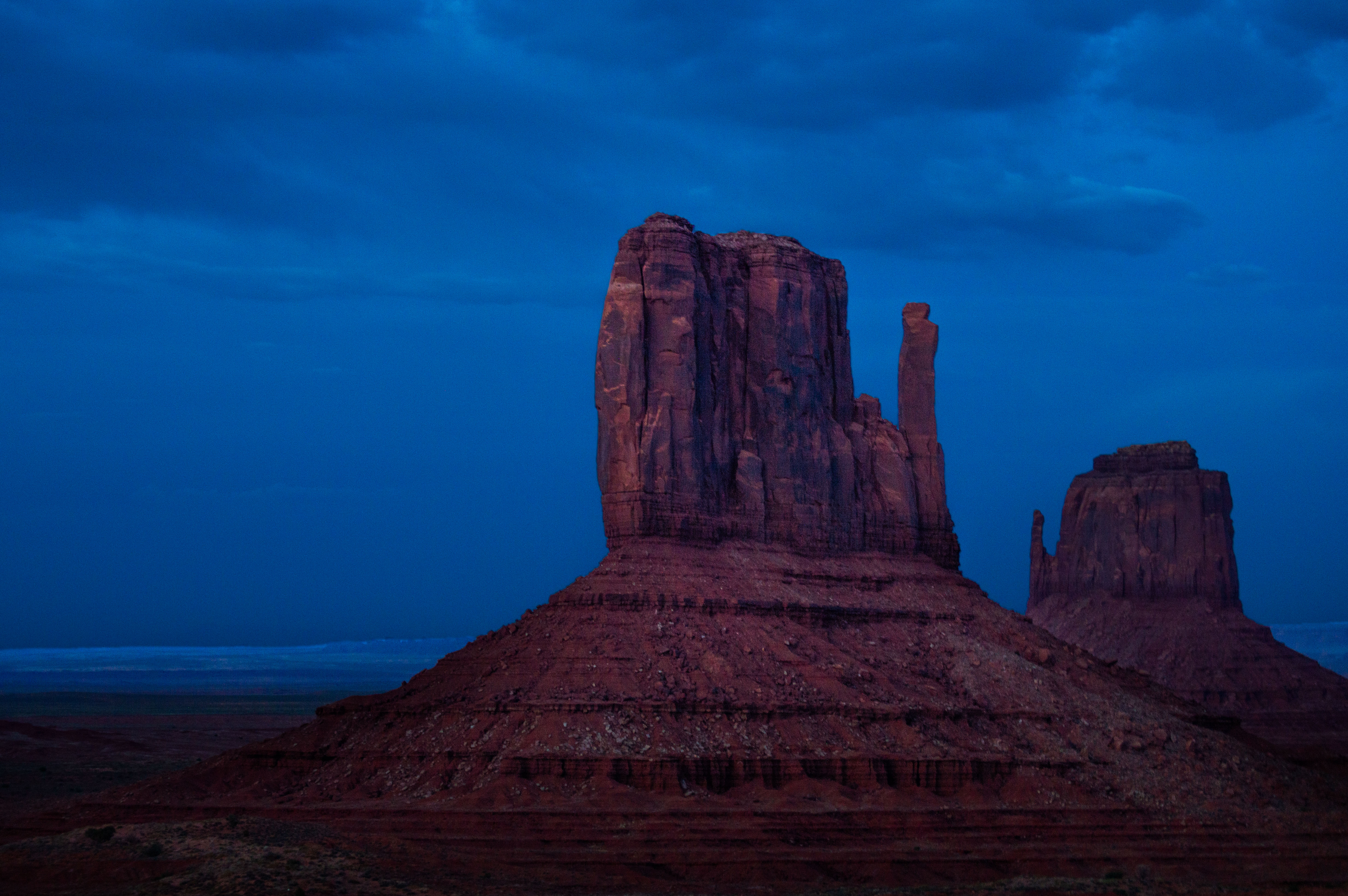 On a pass through Monument Valley, we stayed the night next to these two rocks, the mittens, and as the sun set behind them, their orange sandstone became a tinted red, and the sky a dark blue. The clouds passed over us, as we had just missed the rain, and before all the light disappeared, I took the photo.