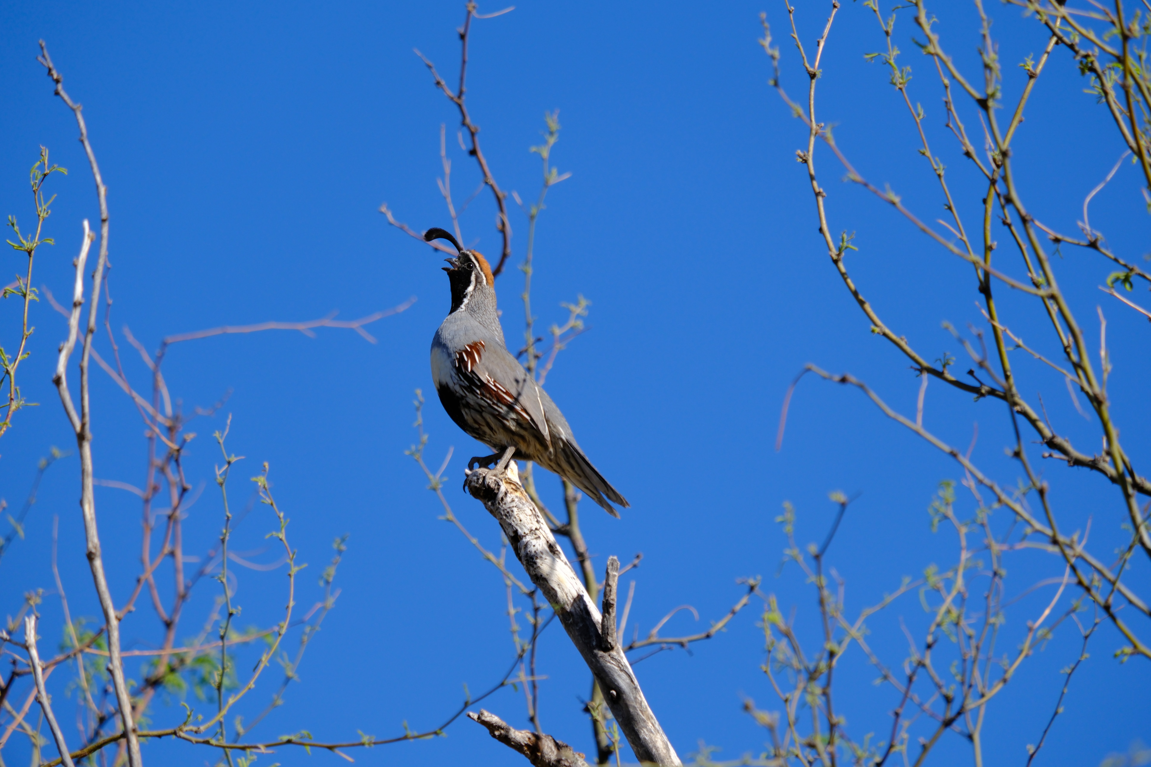 A Gambel's quail, caught mid-tweet, atop the brush in Catalina, AZ. Taken on April 16, 2025.
