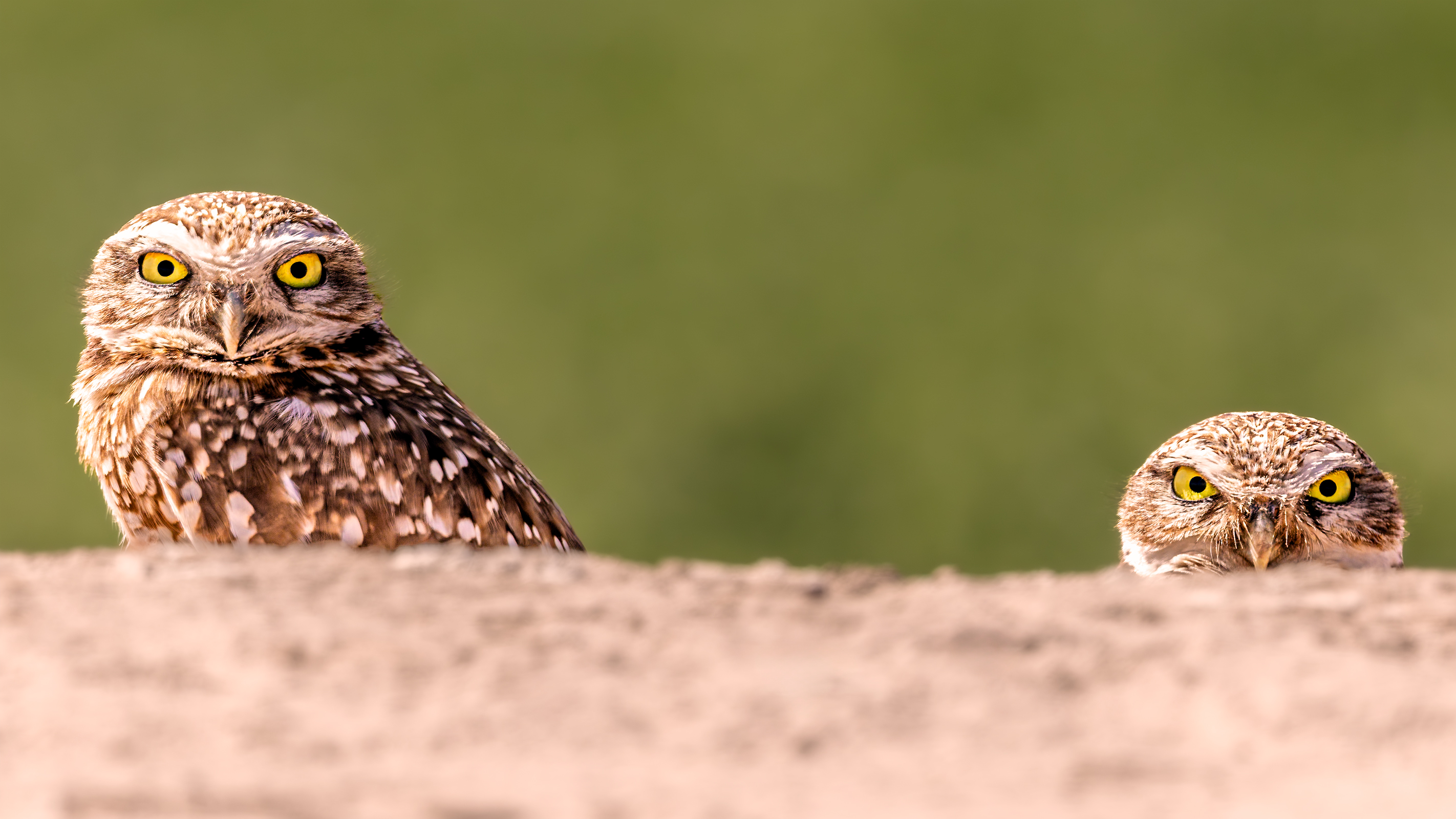 Two burrowing owls share a moment at their desert burrow—one on lookout, one peeking from below.