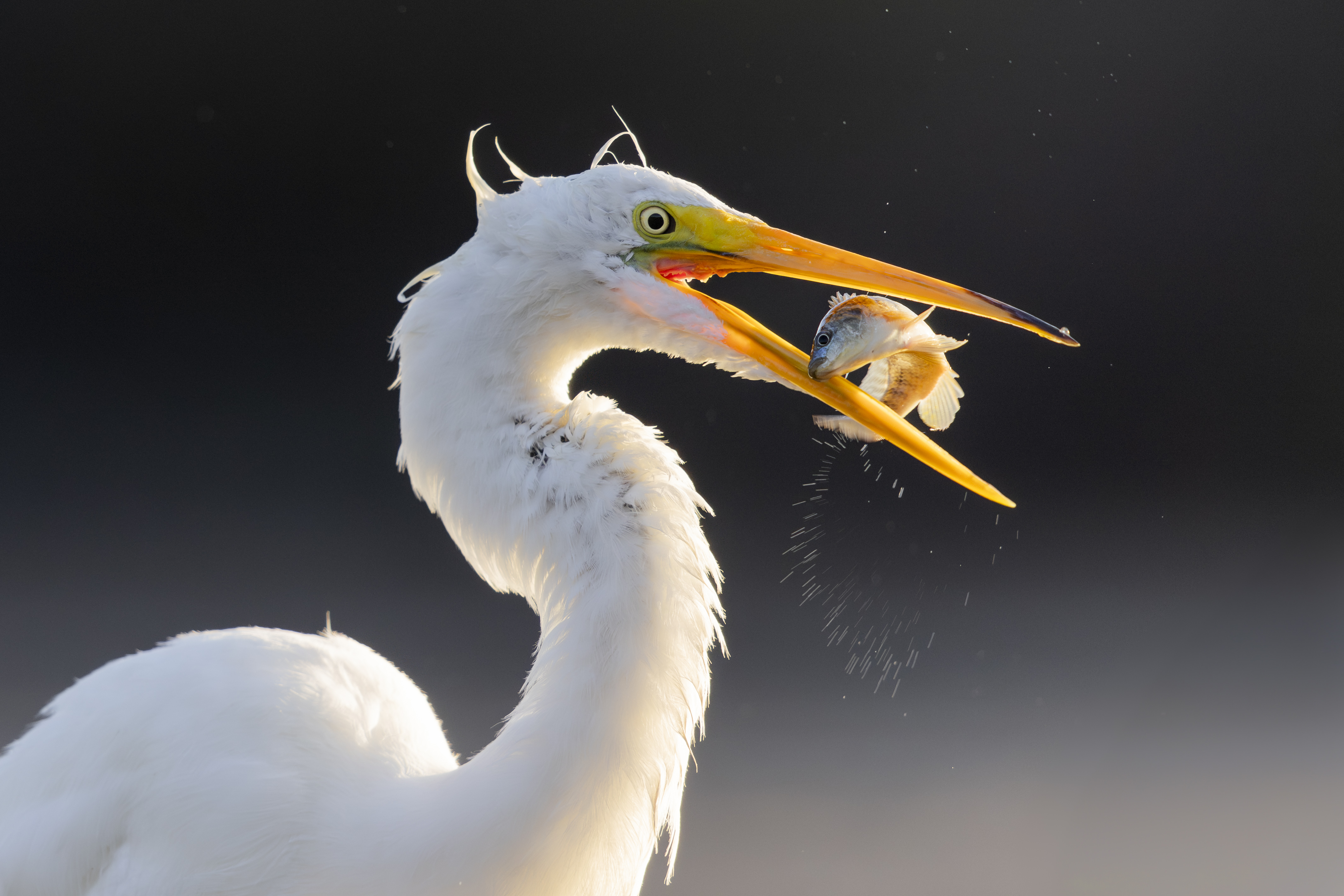 Great egret wrestling a fish in some early morning sunlight