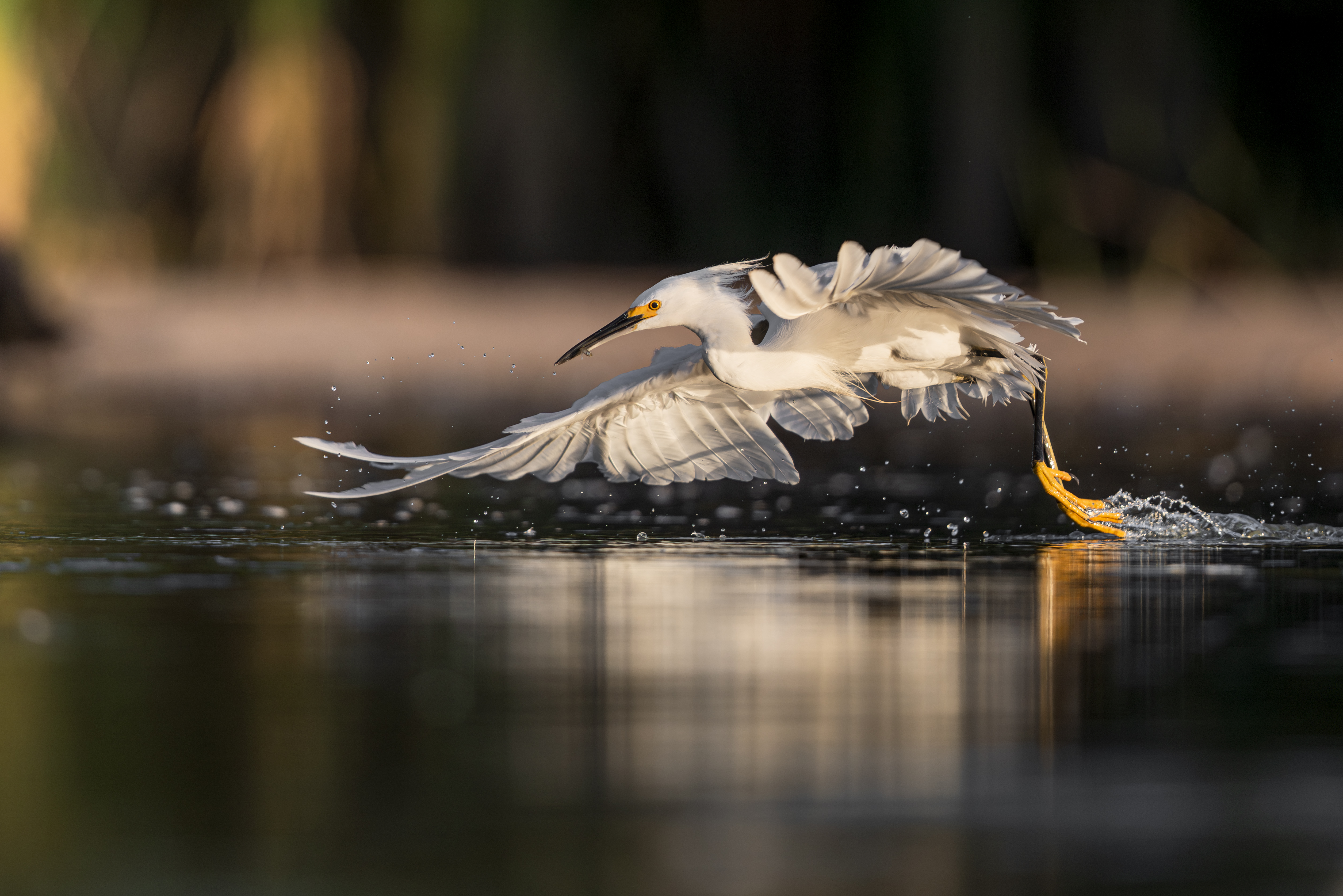 Snowy egret looks like its running across the after grabbing a tiny fish for a snack during flight