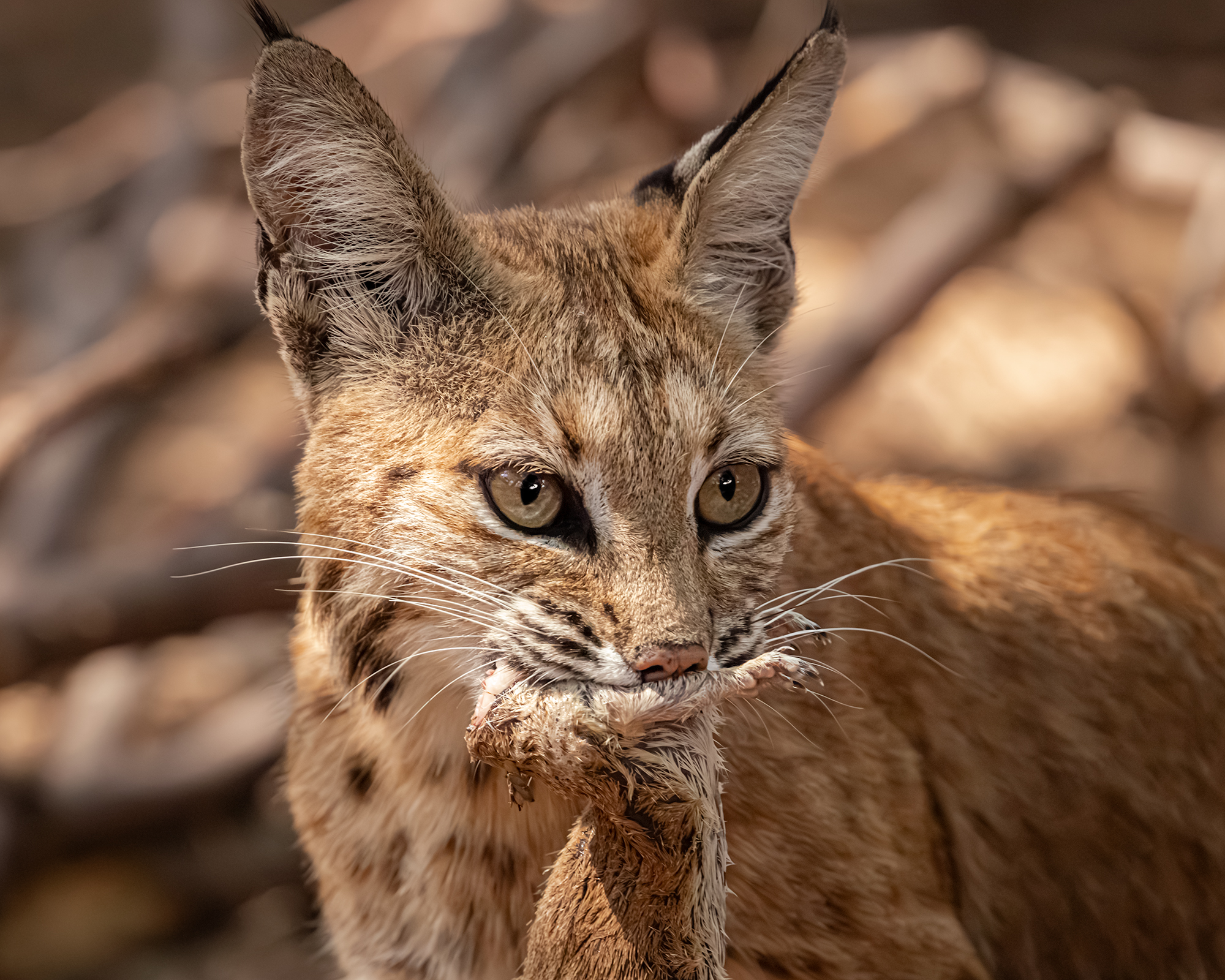 A wild bobcat pauses in the desert heat with a fresh catch, its golden eyes fixed and alert. Midday light revealed a rare moment of survival and instinct as it moved through the scrublands.