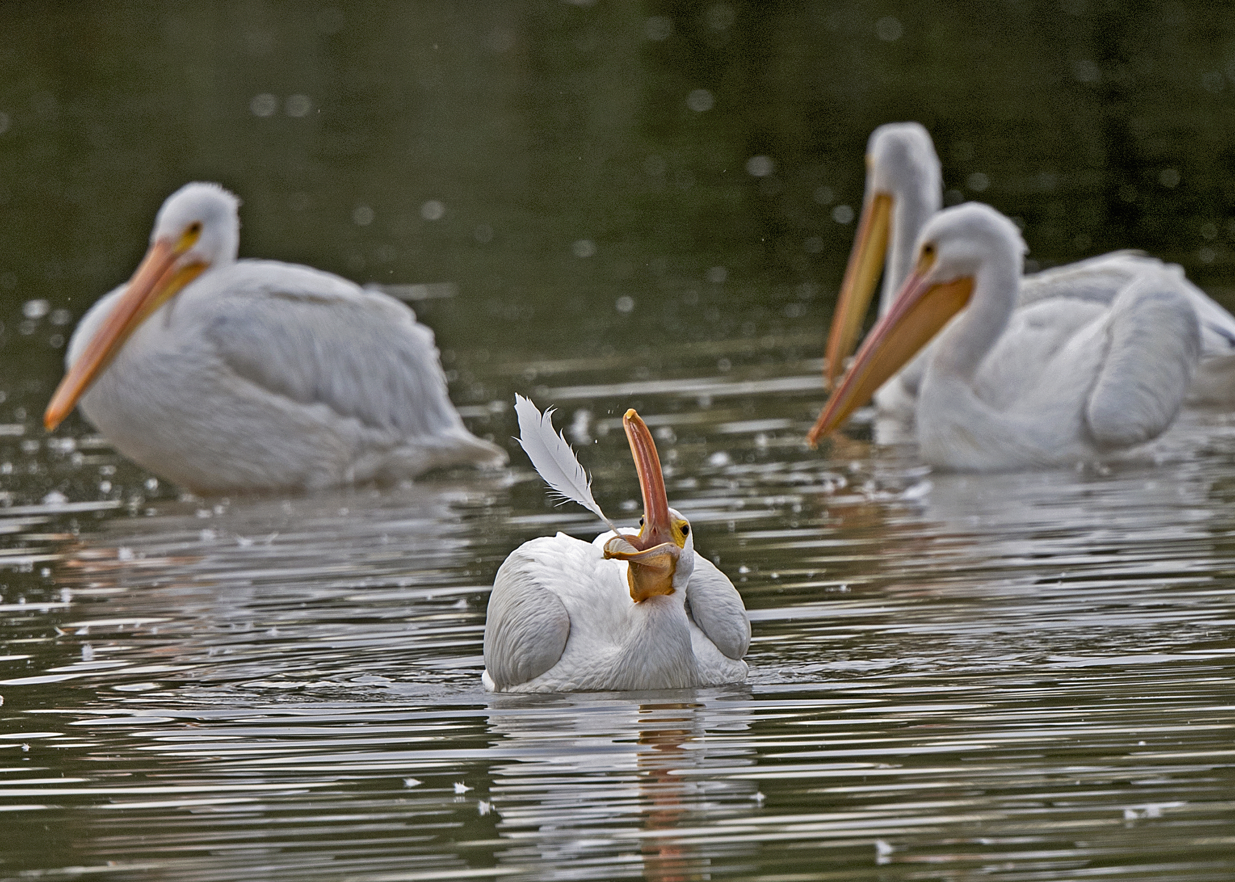 Beautiful Pelican trying to grab its own feather in Riparian Preserve.
