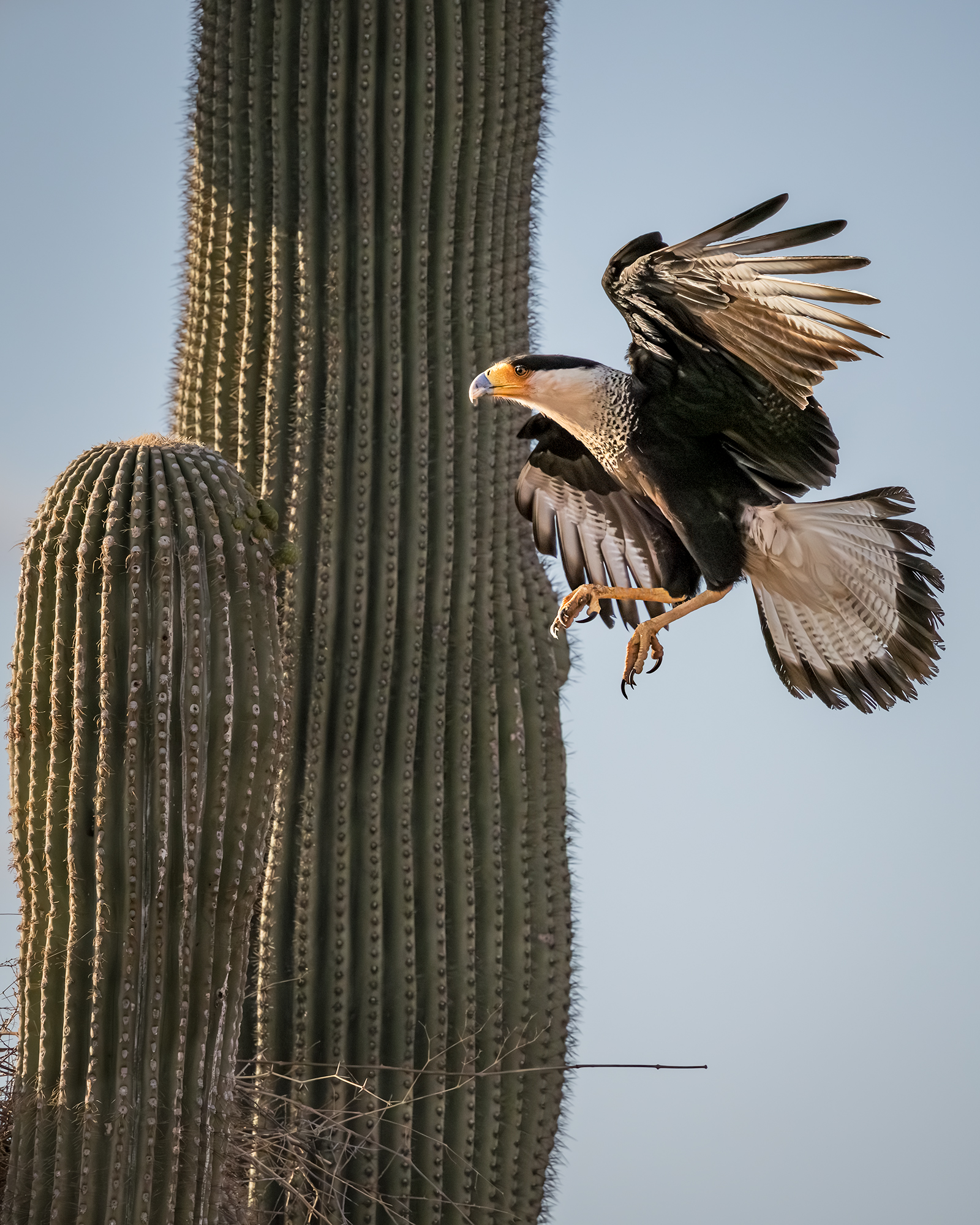 A Crested Caracara ascends toward it's saguaro nest at sunset, the desert light revealing each feather. A rare desert raptor framed by the towering saguaros of the Sonoran landscape.