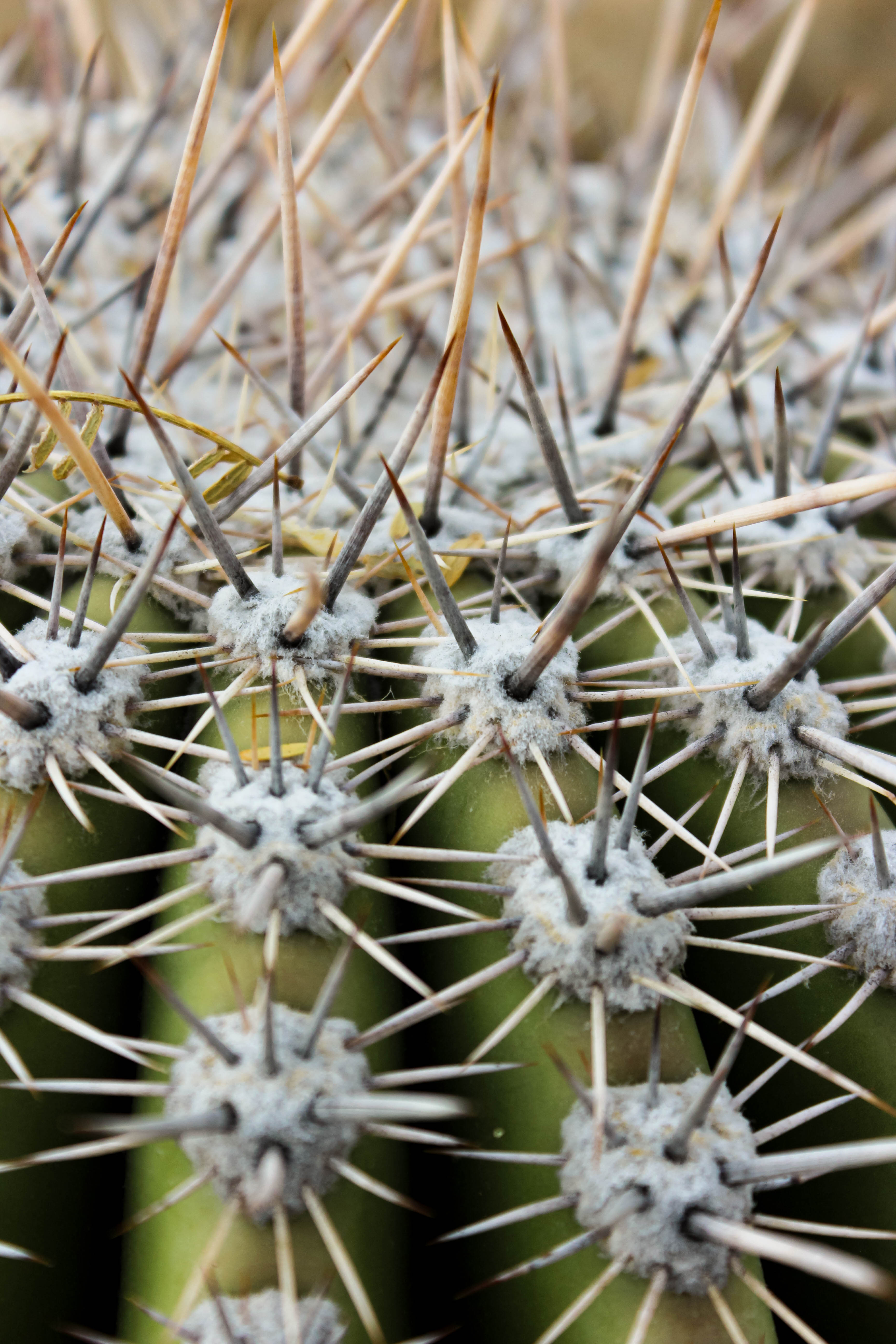 I was on Mount Lemmon a few days ago, walking through the lower regions among the plants and stones. As I was walking, I was growing increasingly more distressed that the sun was getting closer and closer to the horizon line, at which point I realized that where I was I would run out of the light I needed for the picture to be visible without having to crank my ISO to disgustingly high values. That's when I found it; a lone Saguaro Cactus, set apart from the other plants. At first, there was nothing I could see of note about this cactus; it wasn't a 100-year-old towering monster, nor did it have any real defining traits that immediately caught my eye. To anyone looking from a ways away, it would seem simply another stout, maybe 10-year-old plant. Then I looked closer. In the shadow of the peaks, with the sun's light rapidly dying, I noticed smaller details I had never noticed in the full glow of the desert sun. Small tufts of fuzz at the base of the spines, with patters of minuscule black spots dotting the pale off-white ends, shades of yellow and red on the flesh I had for so long believed to be a solid shade of flat green. Most interestingly to me were the barely visible vein-like structures spanning the spines, and the bands that surrounded the long poles like bracelets. Just before the sun could set, I reached as closely as I could into the very top of the cactus and snapped a photo of the small forest of dangerous beauty.