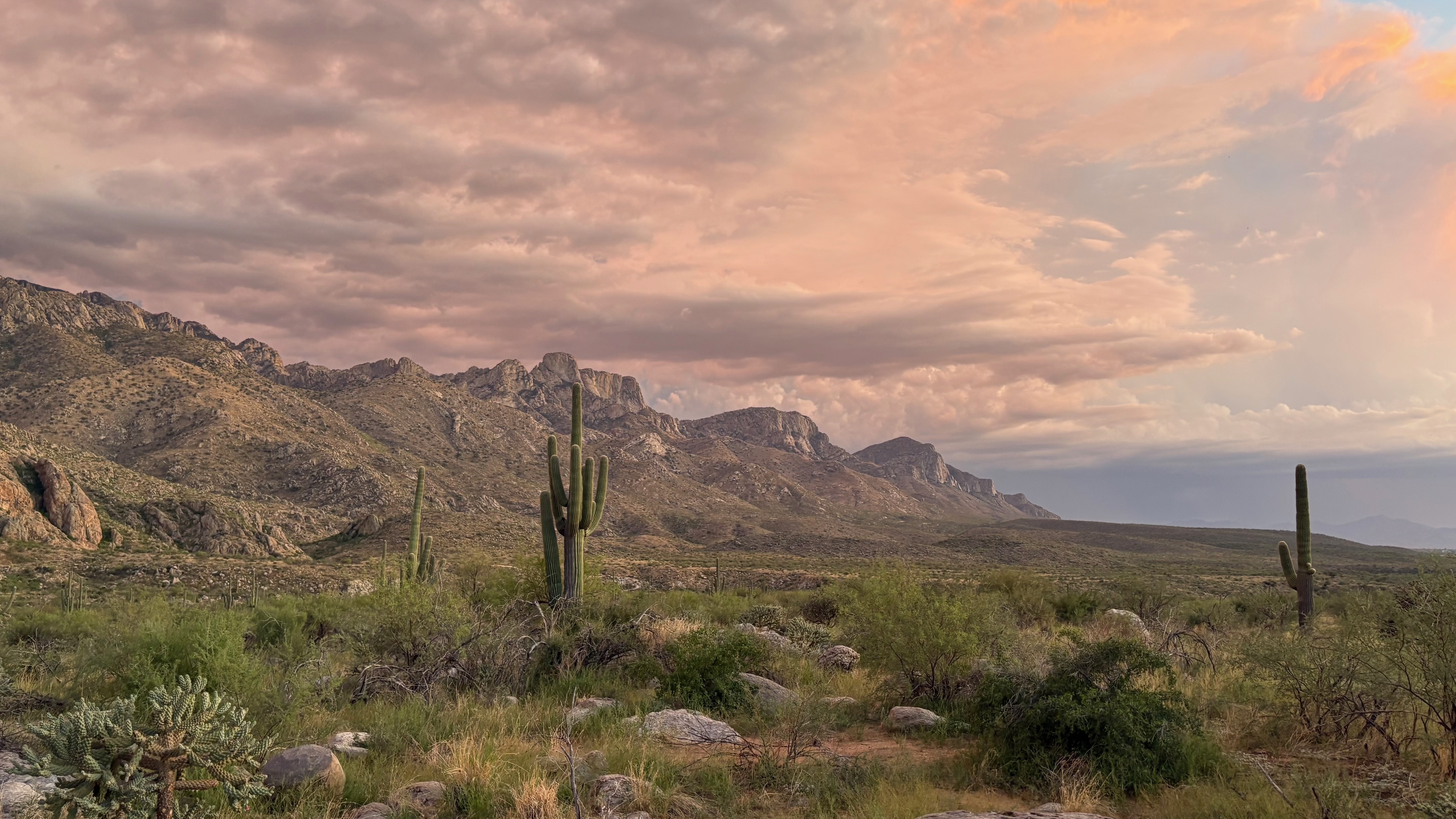 Sunset glow reflecting off the clouds as a monsoon storm rolls in over Catalina State Park.