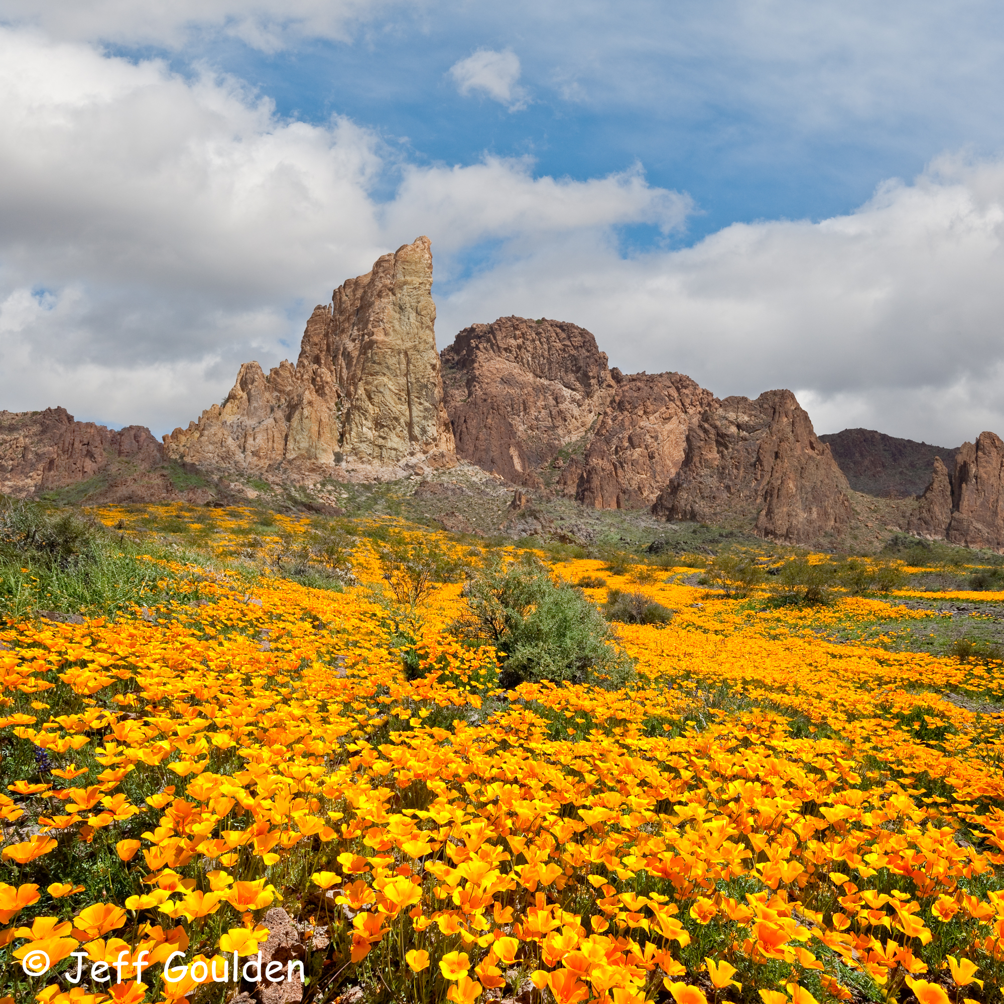 California poppies blanket the hillsides at Sitgreaves Pass in Arizona’s Black Mountains, where historic Route 66 follows the path of Beale’s 1857 wagon road.