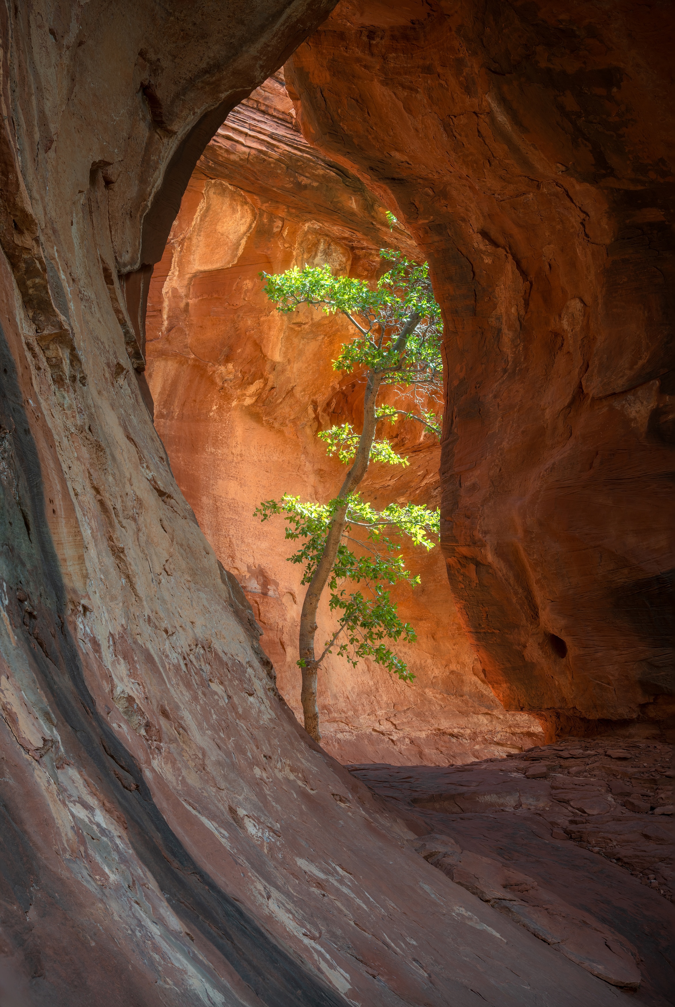 Sun lit tree up in the cliffs of Sedona
