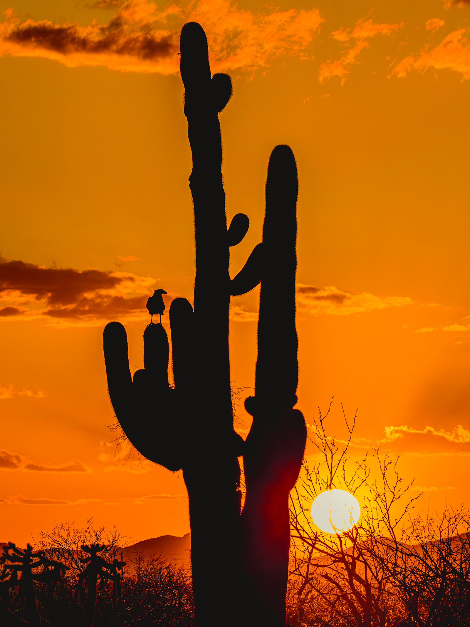 A Crested Caracara scans the desert from a Saguaro perch as the sun sinks low over Tucson’s rugged landscape. Bathed in golden light, this striking raptor watches for movement below.
