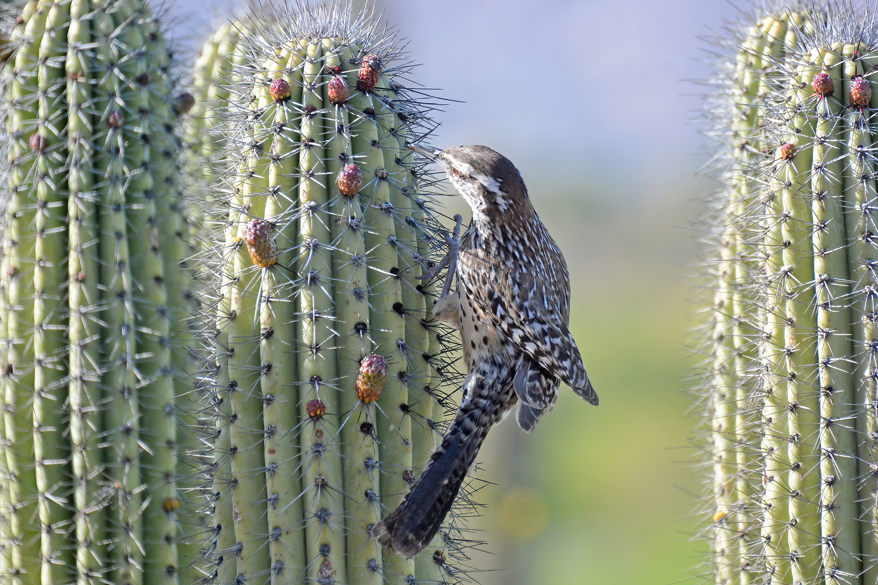 A Cactus Wren forages for fruit on an Organ Pipe Cactus.