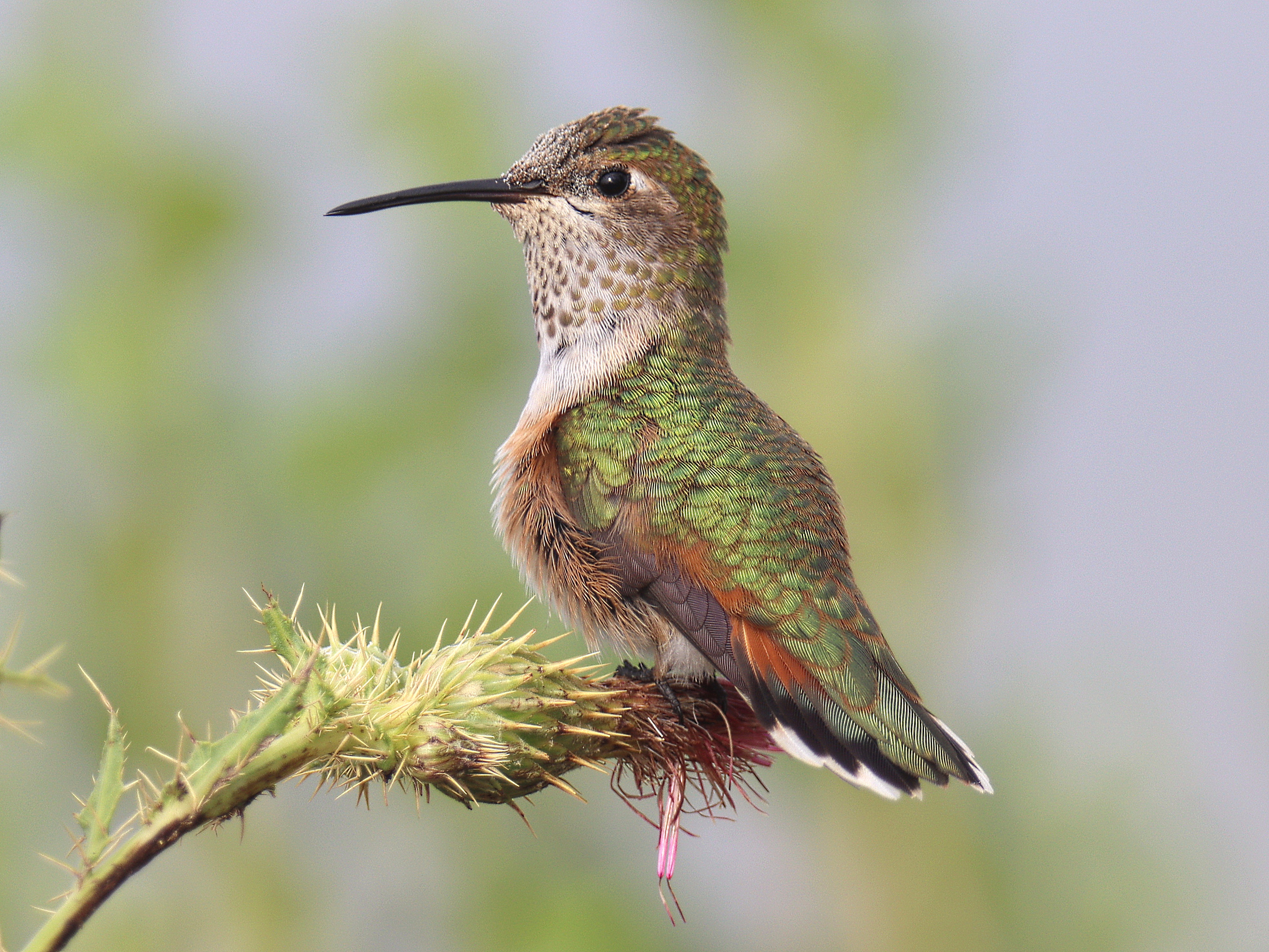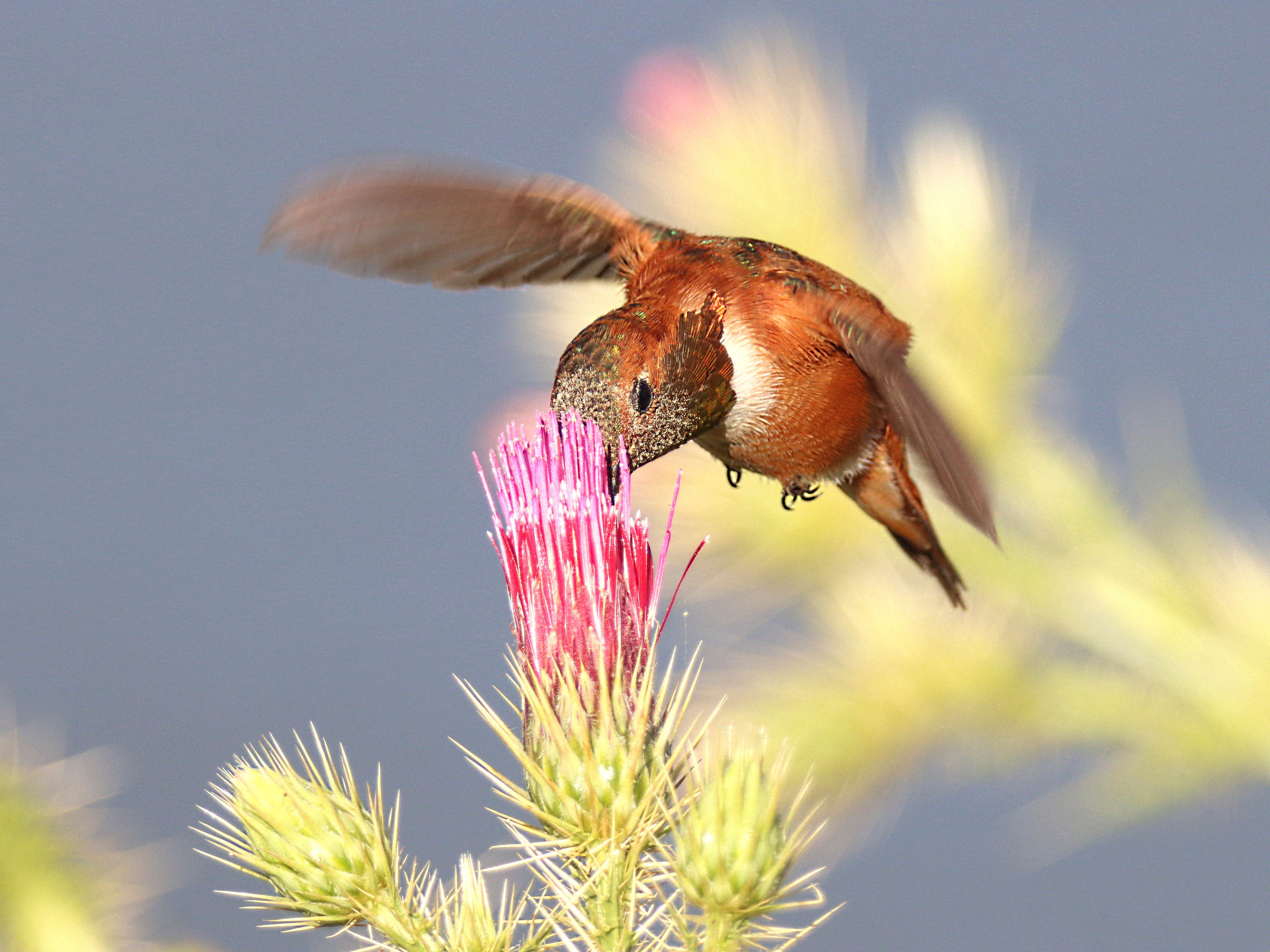 A male Rufous hummingbird feasting on the nectar of a thistle bush.