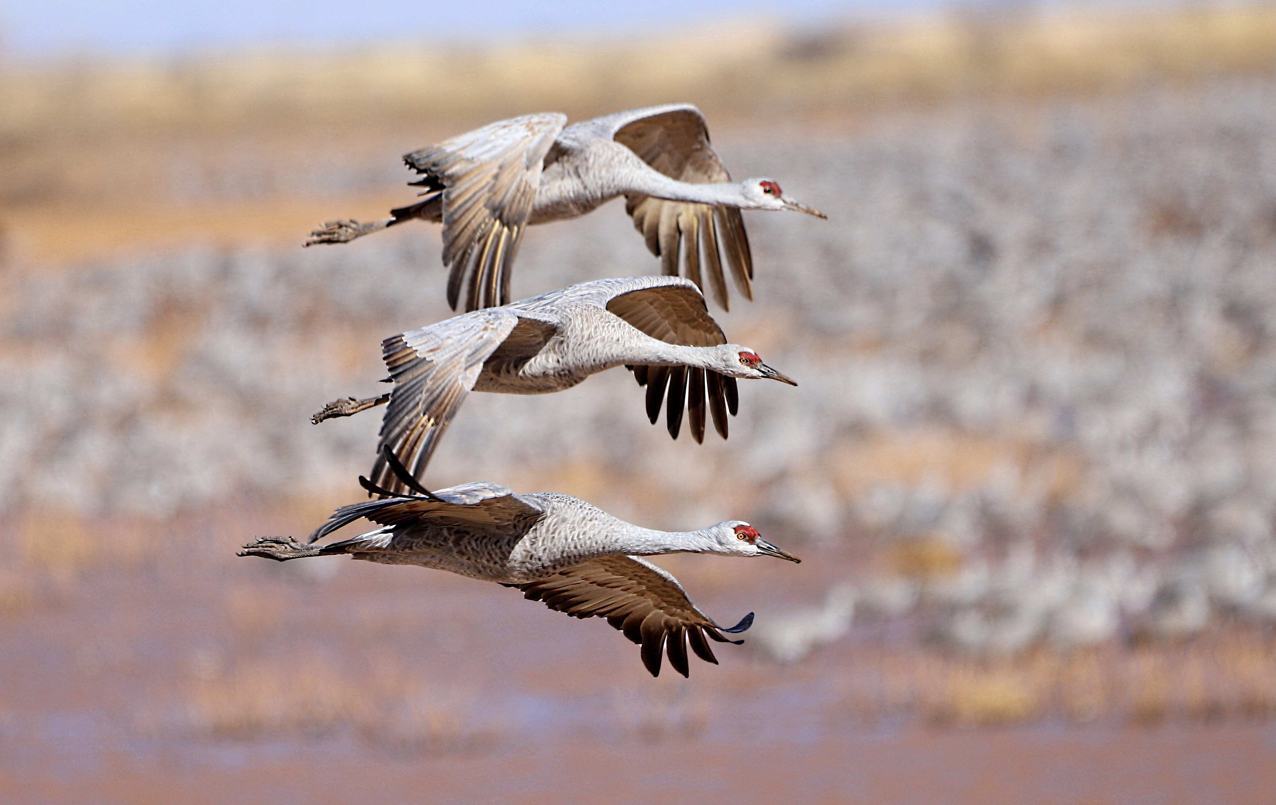 A TRIO formation of SANDHILL Cranes does a fly by .