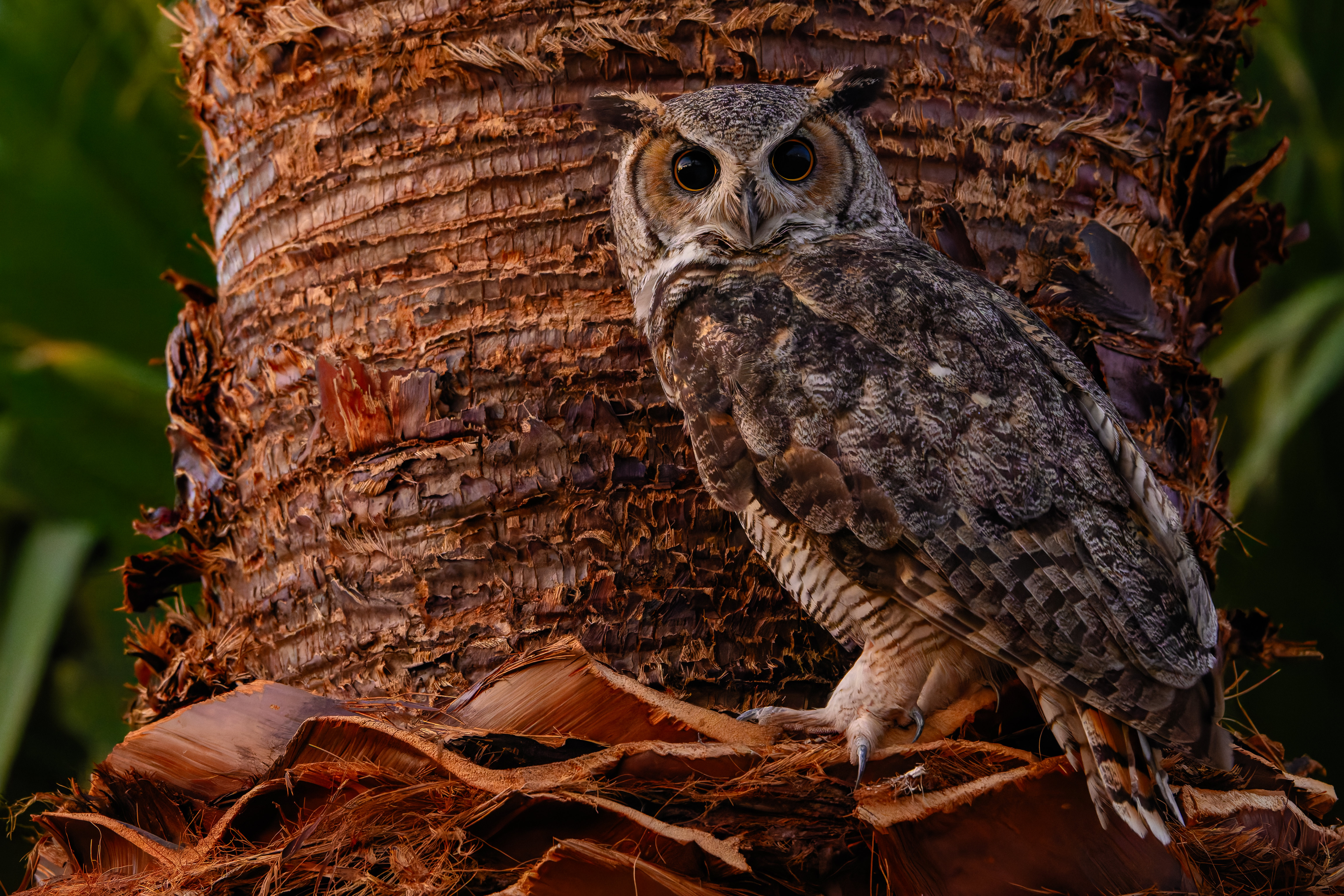 An adult Great Horned Owl looks out from a palm tree, this adult was a parent to two chicks this year!