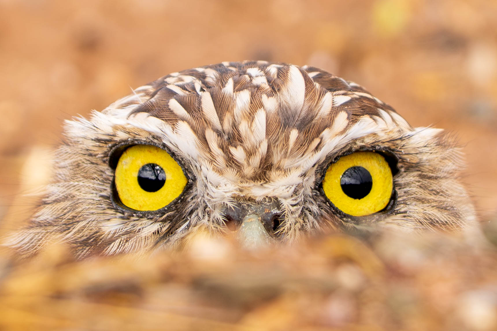 Close-up of an owlet looking out from its burrow.