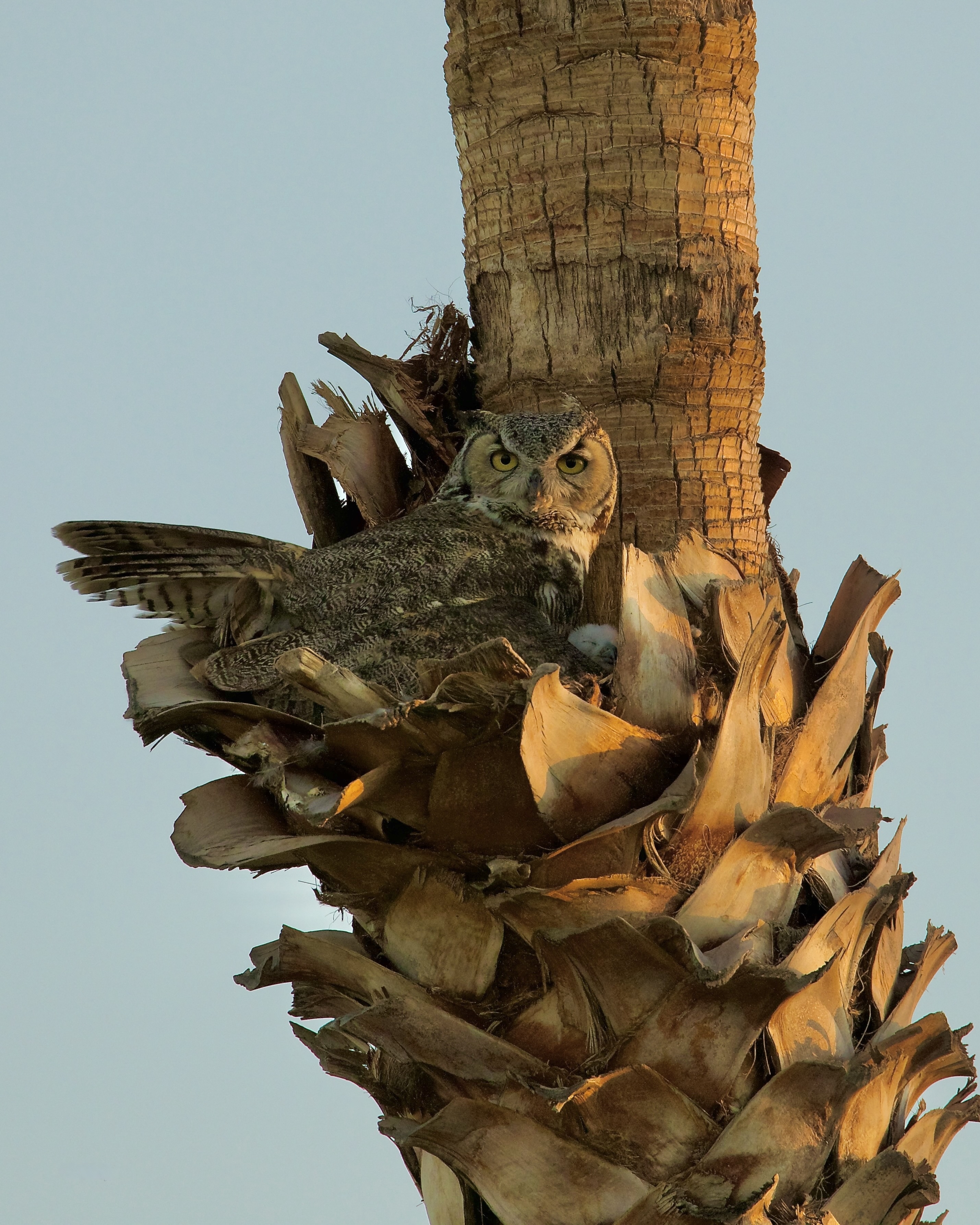 Great Horned Owl female exposing her few days old hatchling to the camera for the first time.