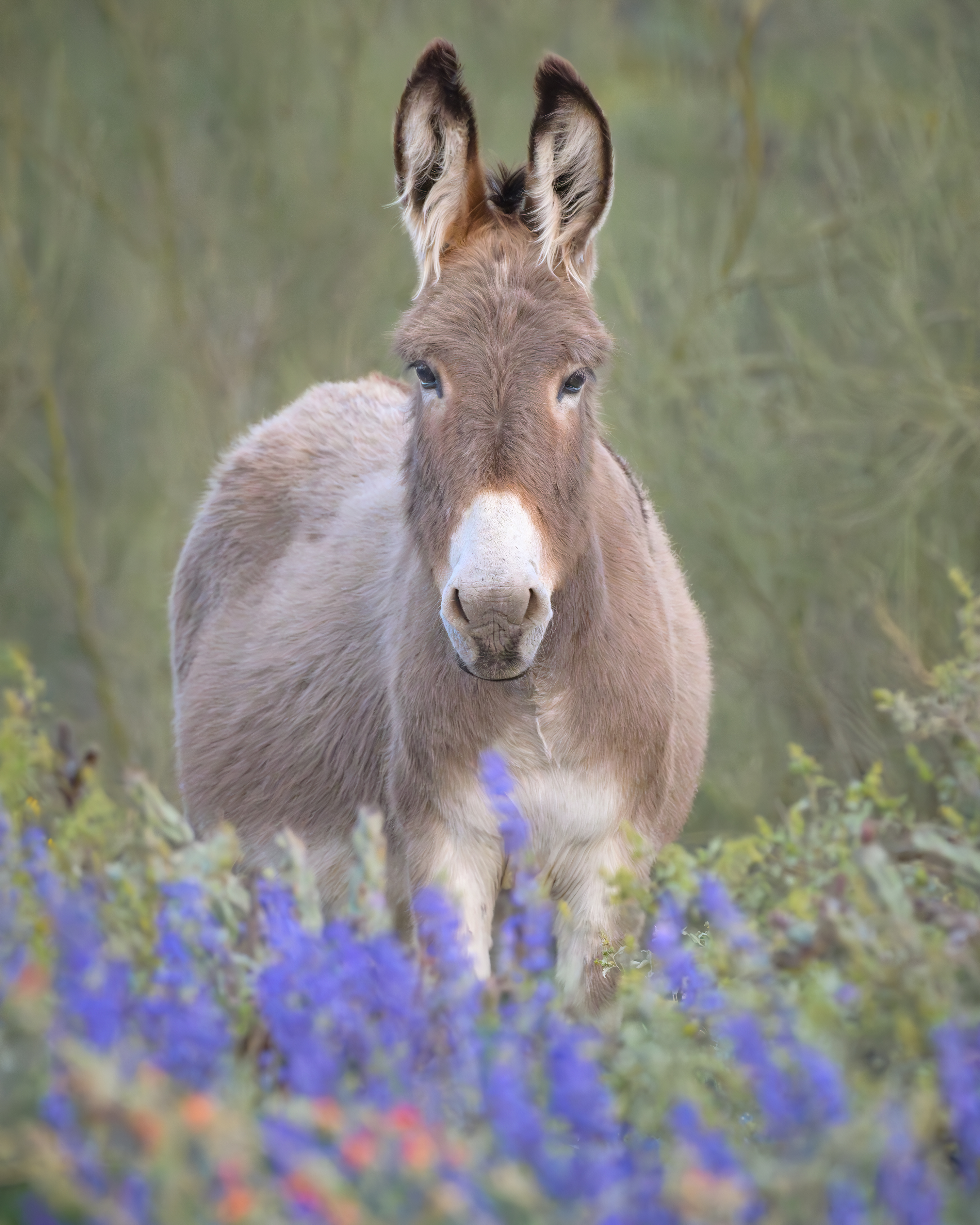 A burro standing in a patch of lupine.