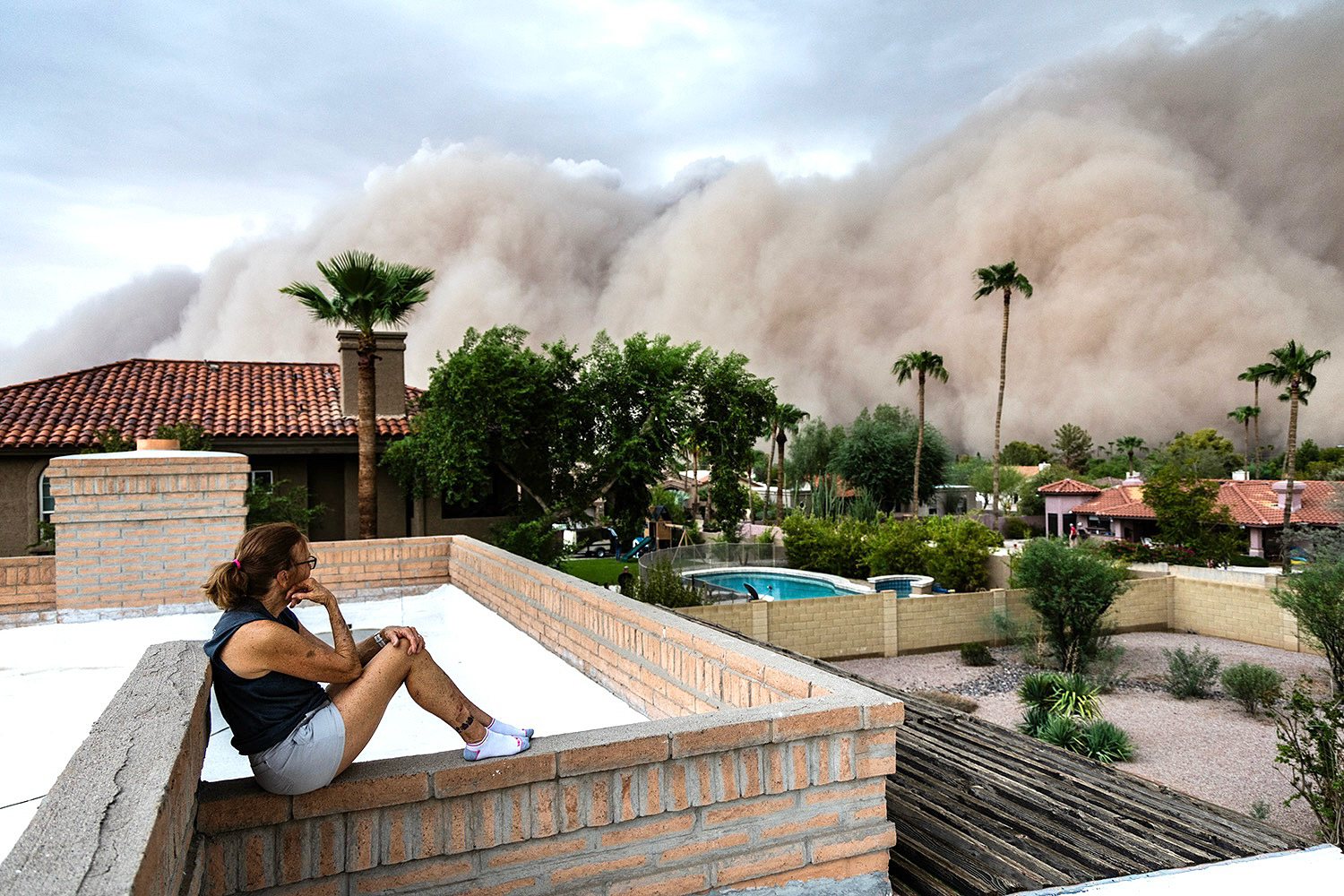 The biggest dust storm in 10 years rolls into Ahwatukee and the metro area Aug. 10. My wife Lorie sits relaxed on the parapet wall of our house. We watched the giant Haboob get closer to our home..