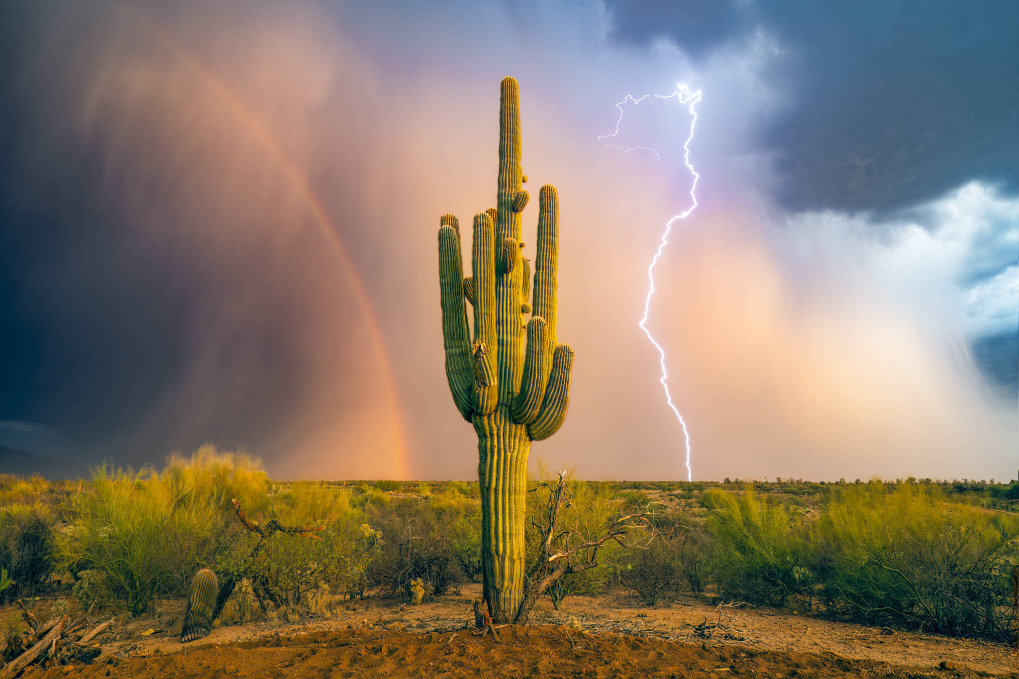A saguaro, a rainbow, and lightning all in one shot. Years of chasing storms and waiting for the right moment… and the desert finally delivered!