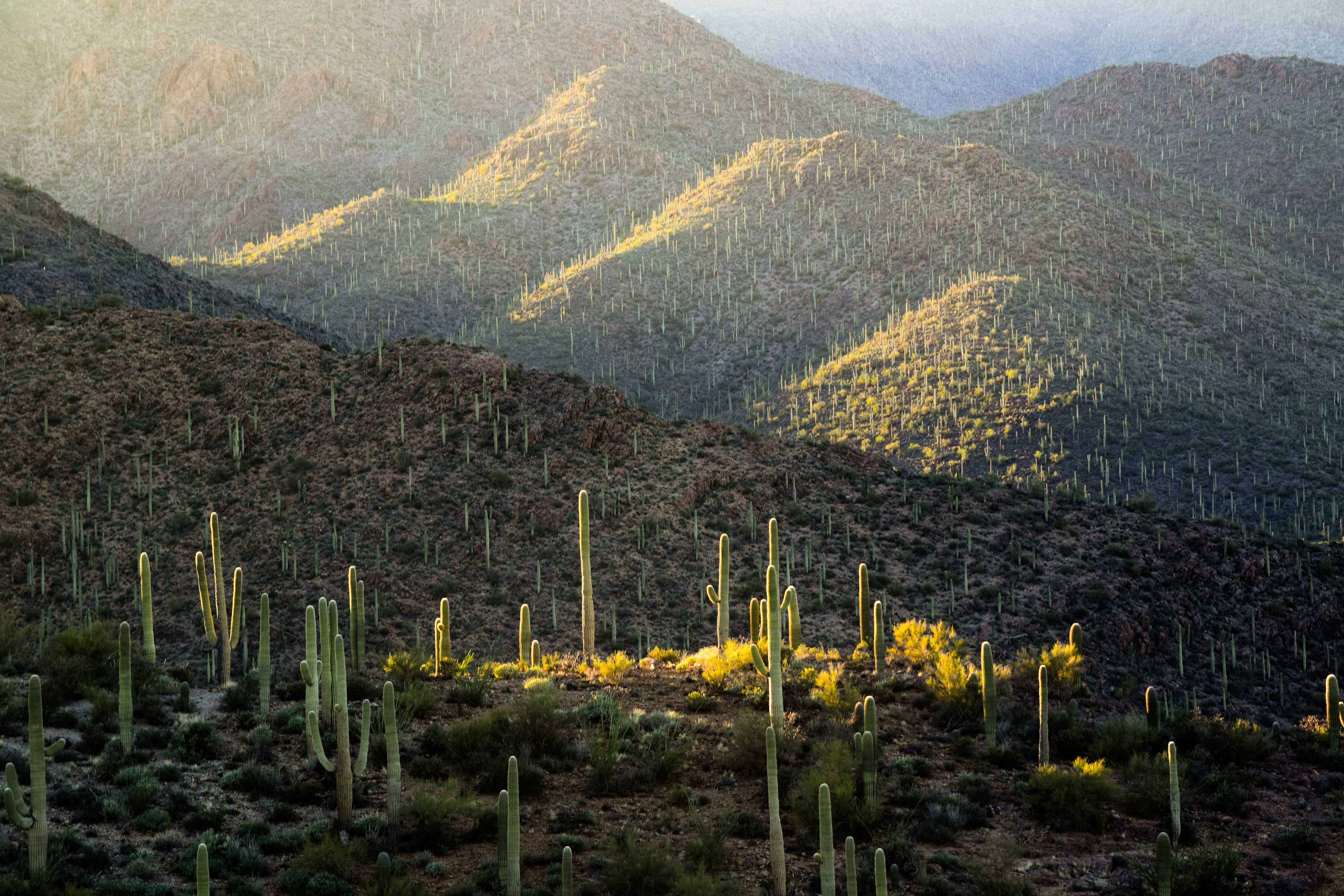 Late afternoon sun illuminates a grouping of saguaros in Tucson Mountain Park.