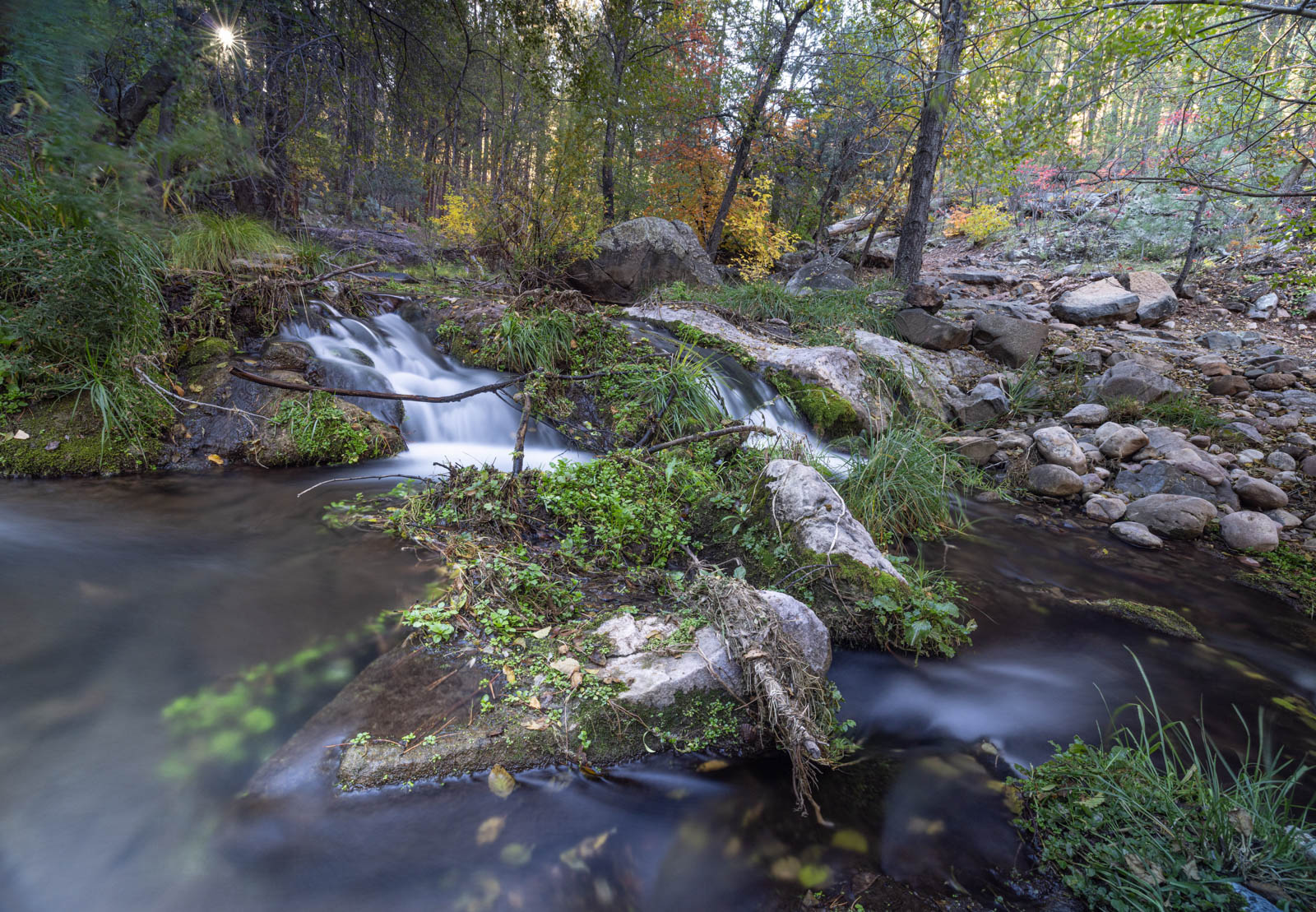 Water cascades over rocks as the sun beams through the trees.