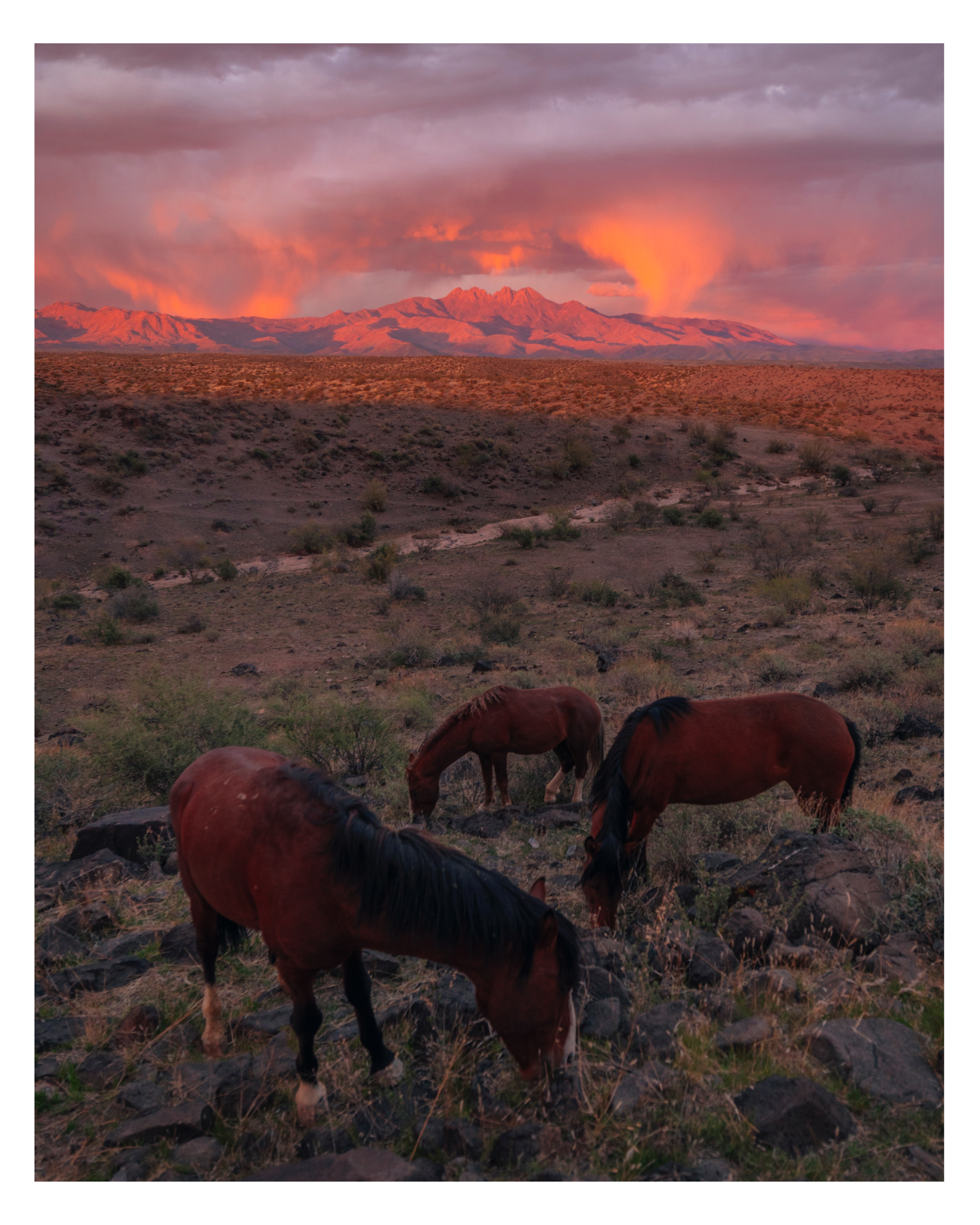 The wild horses of the Salt River area snack during an incredible stormy sunset over Four Peaks. A once in a lifetime moment from taken in the springtime.