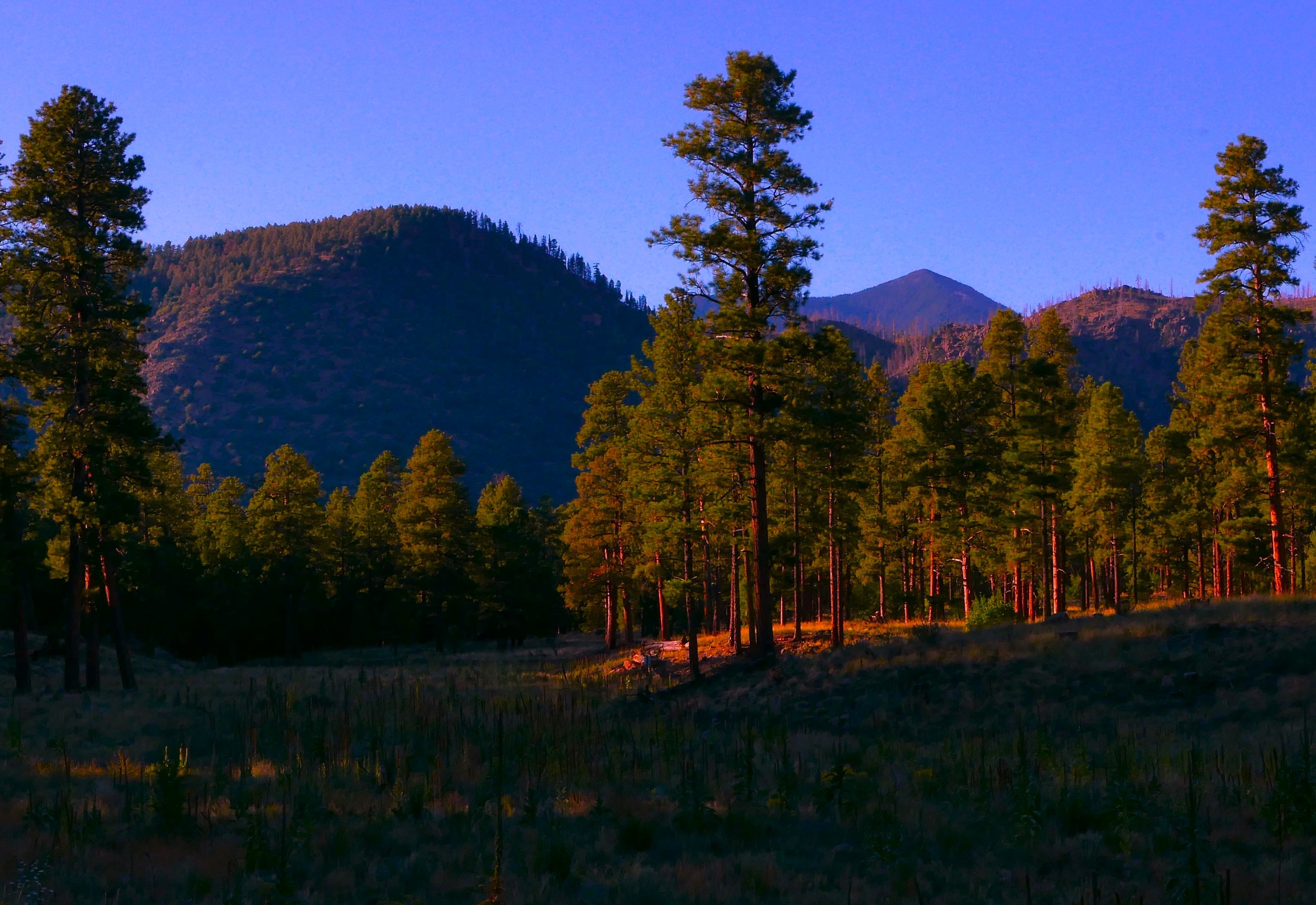 Rays from the setting sun spotlight a stand of Ponderosa Pines.