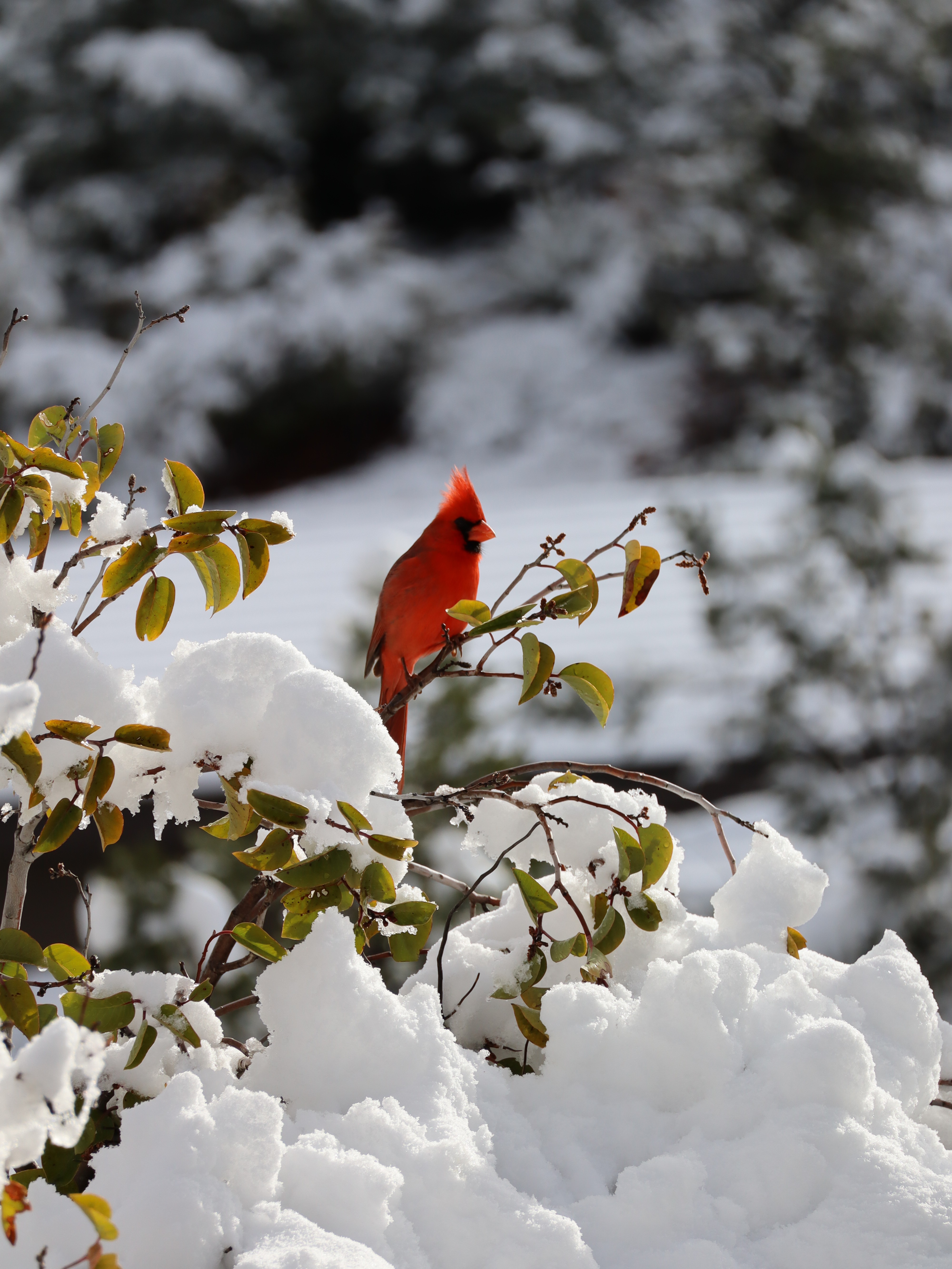 A vibrant scarlet cardinal perched on a snowy branch in Sedona
