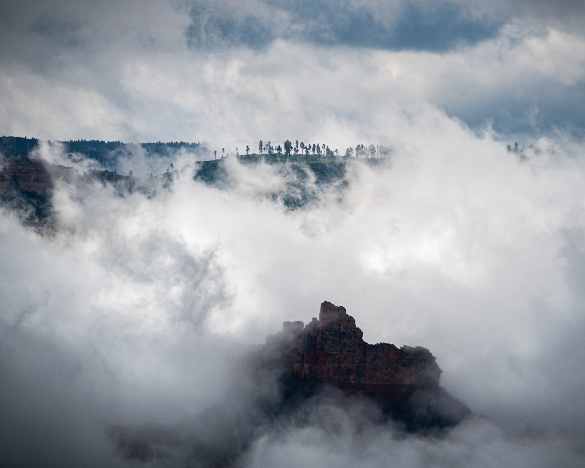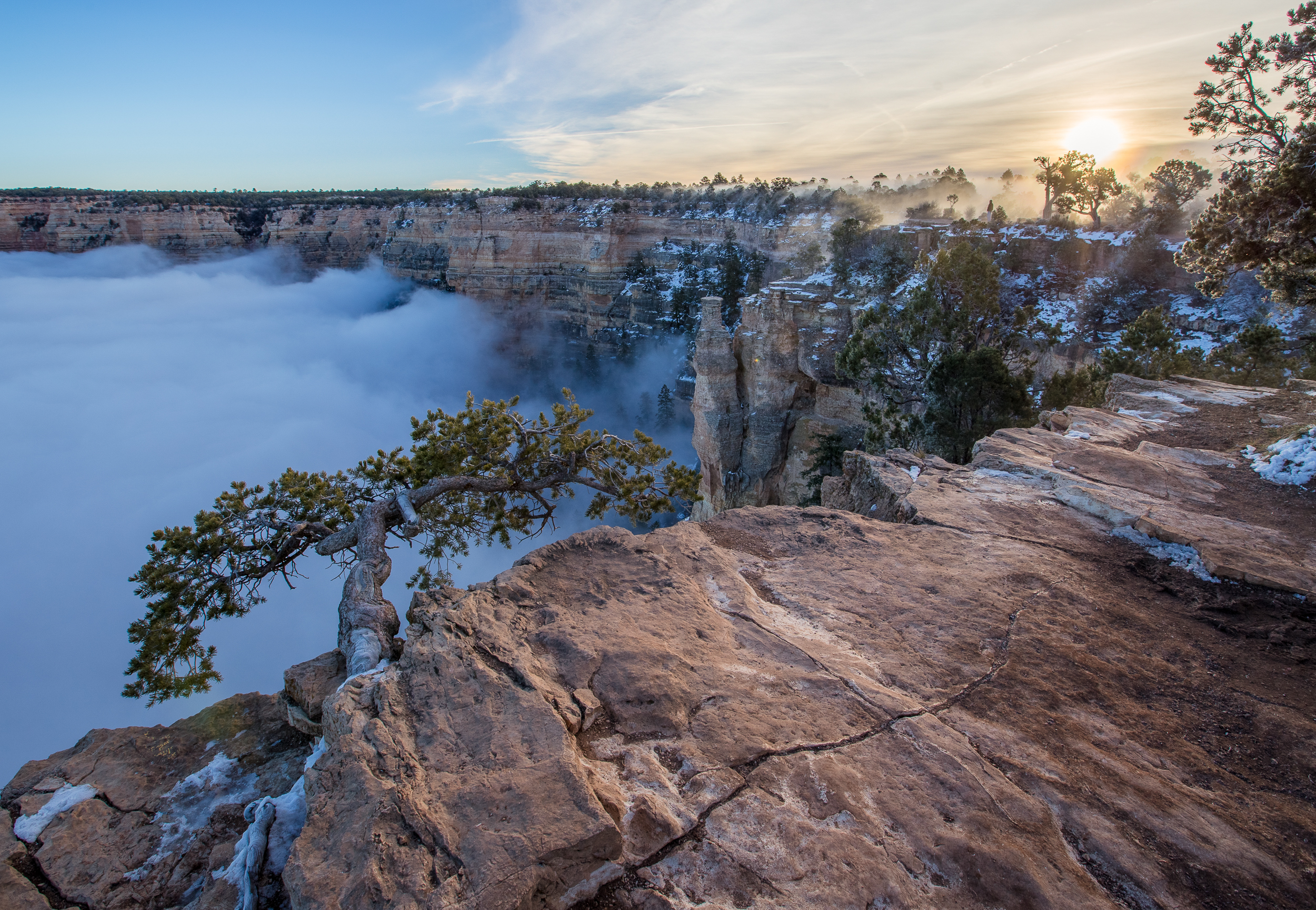 Lone observer - cloud inversion in the Grand Canyon. Surrounded by mist, a solitary soul observes the clouds rolling within the depths of the Grand Canyon at sunrise.