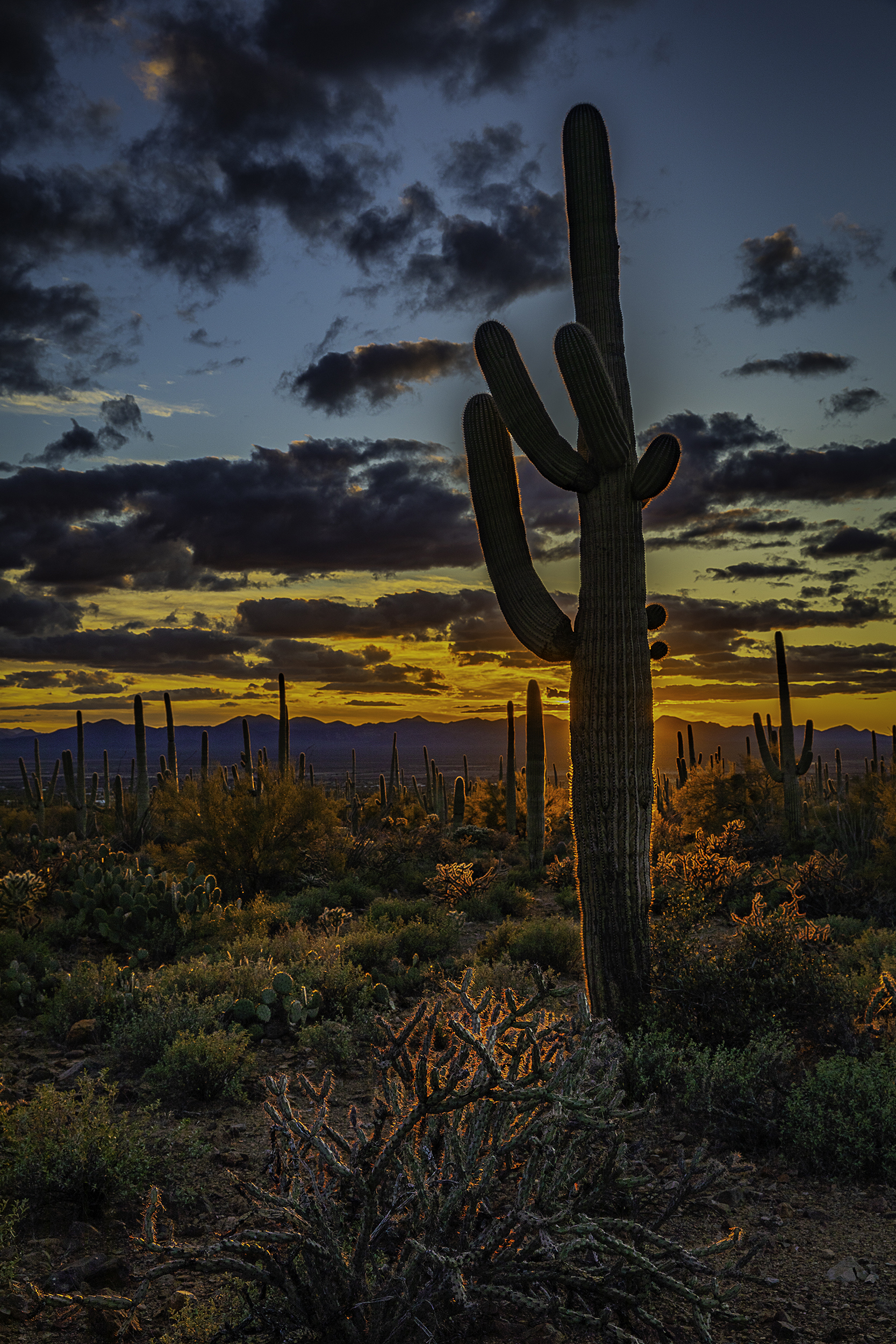 With partly cloudy skies the desert looked like it was on fire as the sun set over the mountains to the west. Using a saguaro cactus to prevent lens flair allowed the capture of this backlight image.
