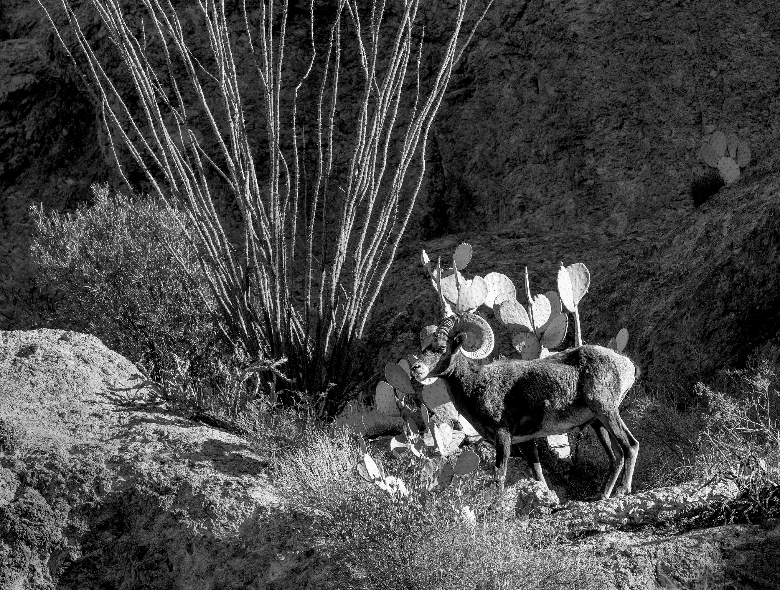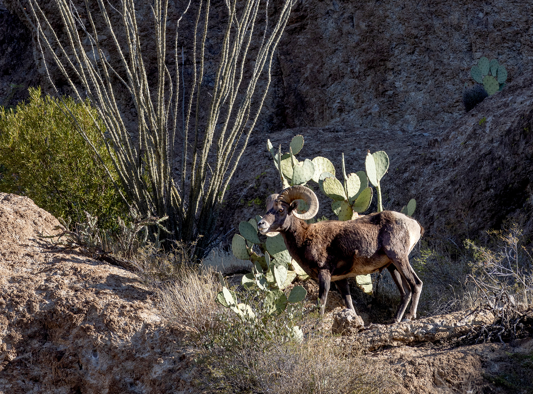 Desert Bighorn Ram by ocotillo and prickly pear cactus