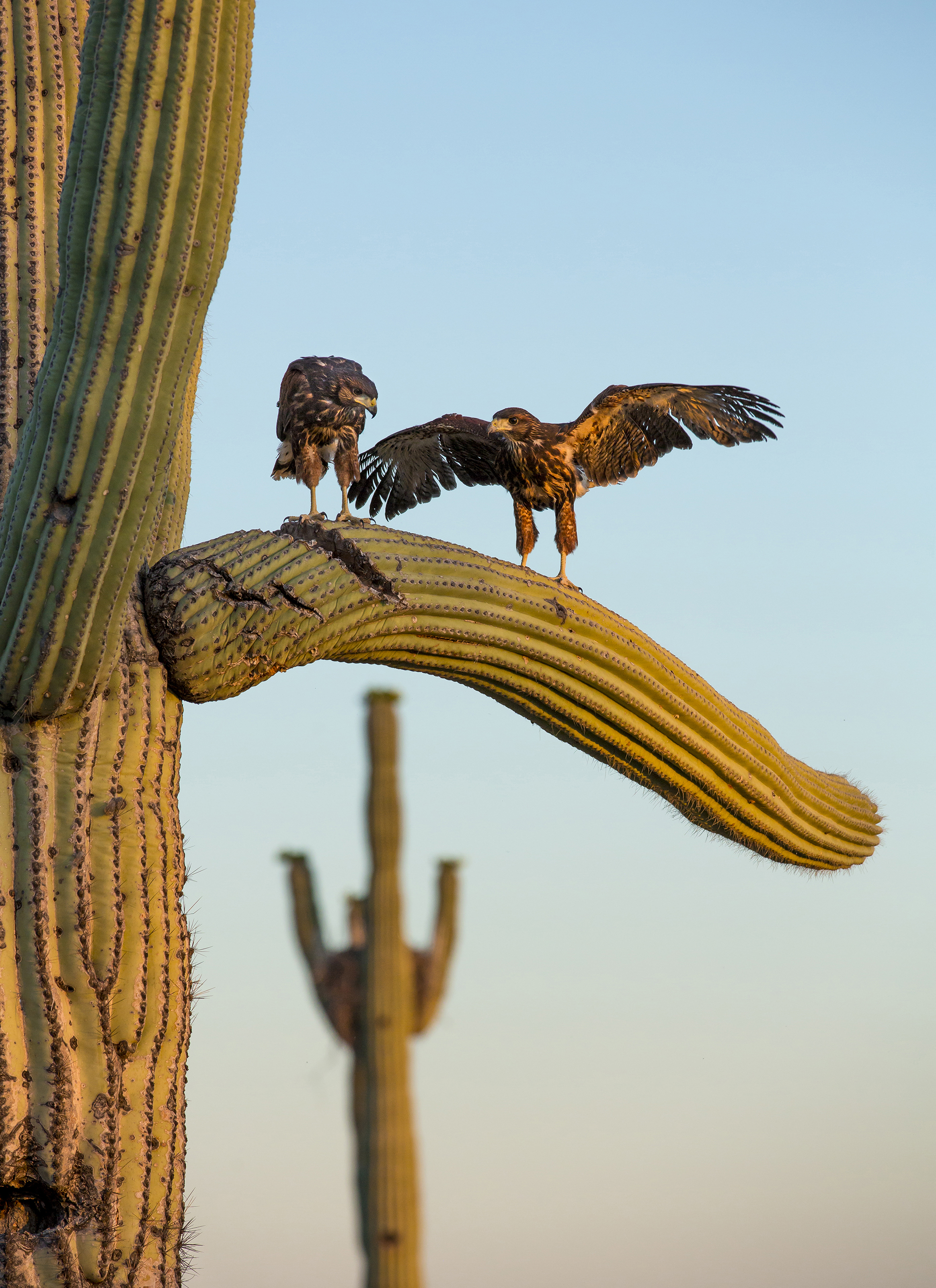 Fledgling Harris hawks trying out their wings on a saguaro