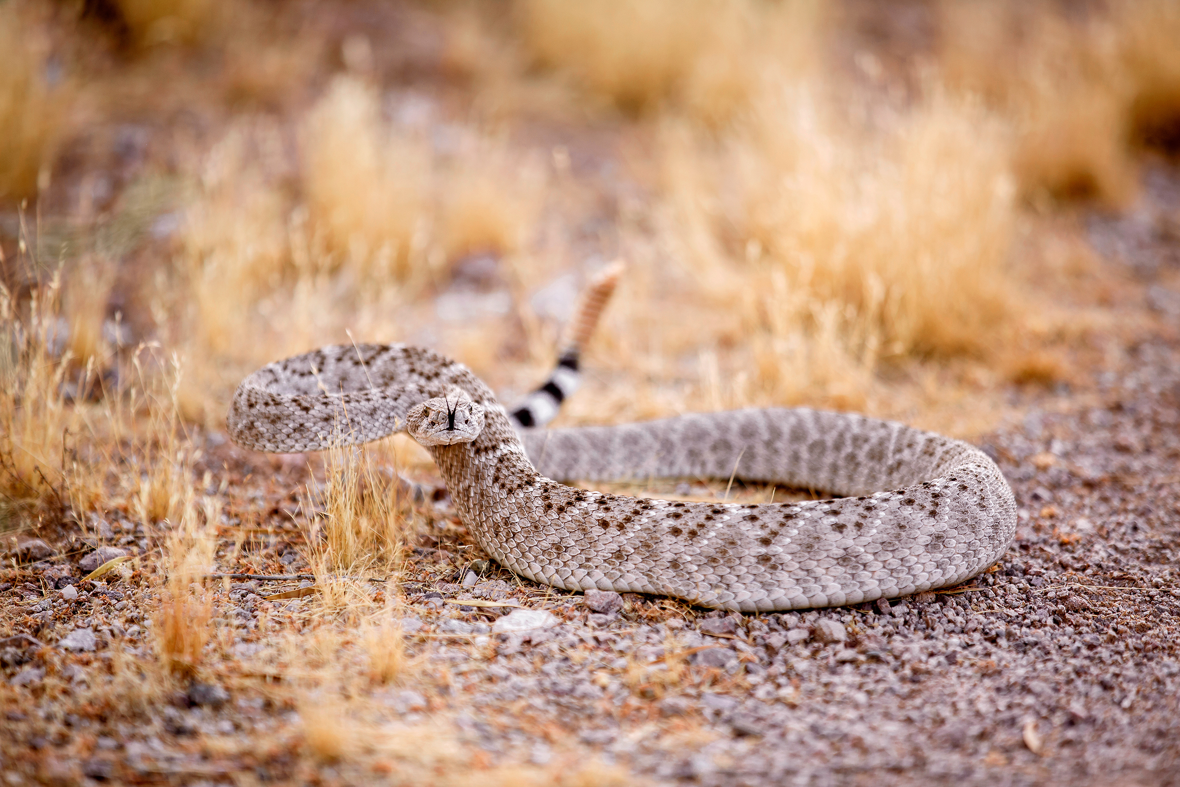 Diamondback rattlesnake in strike position from mouse eye level.