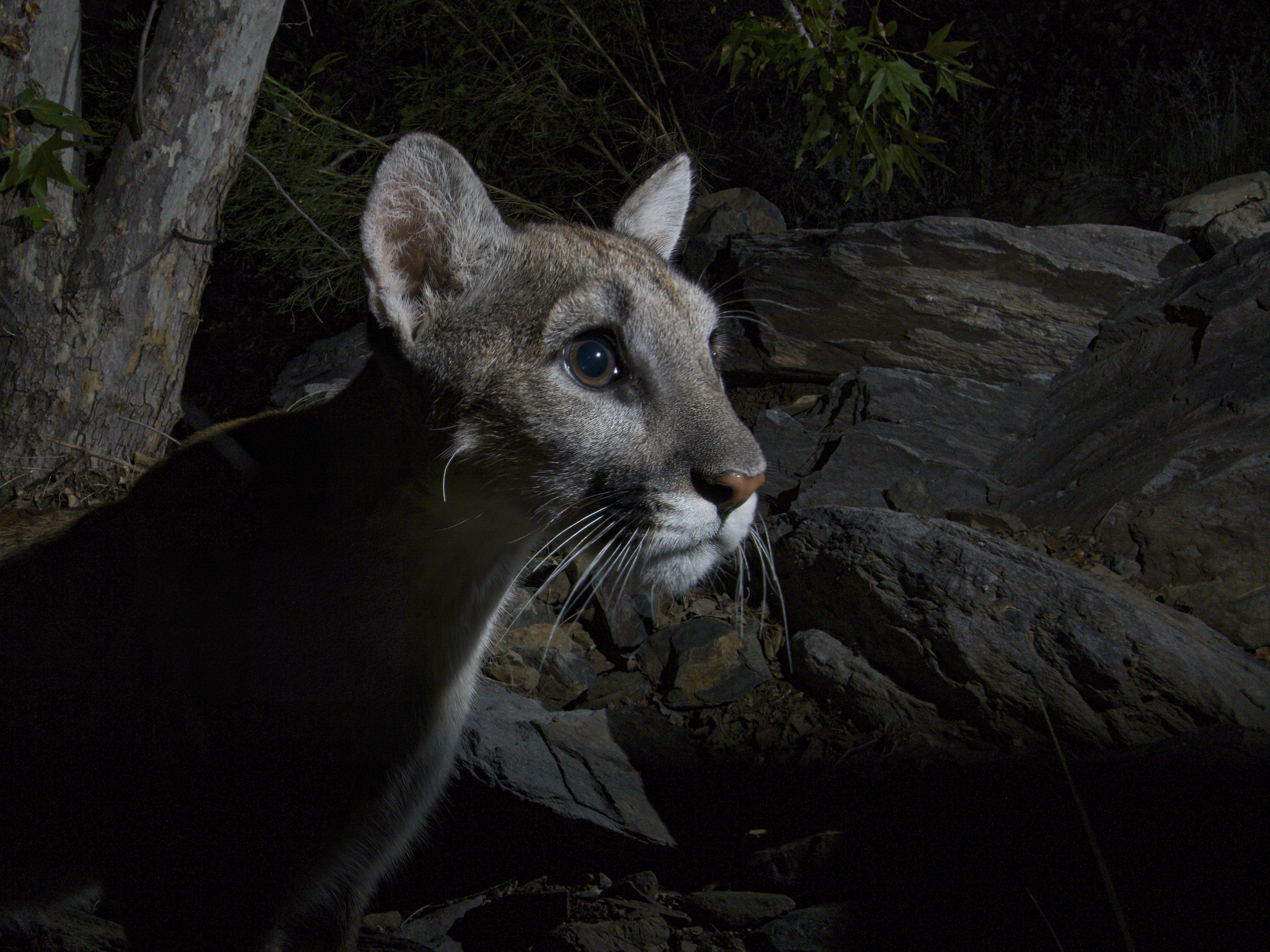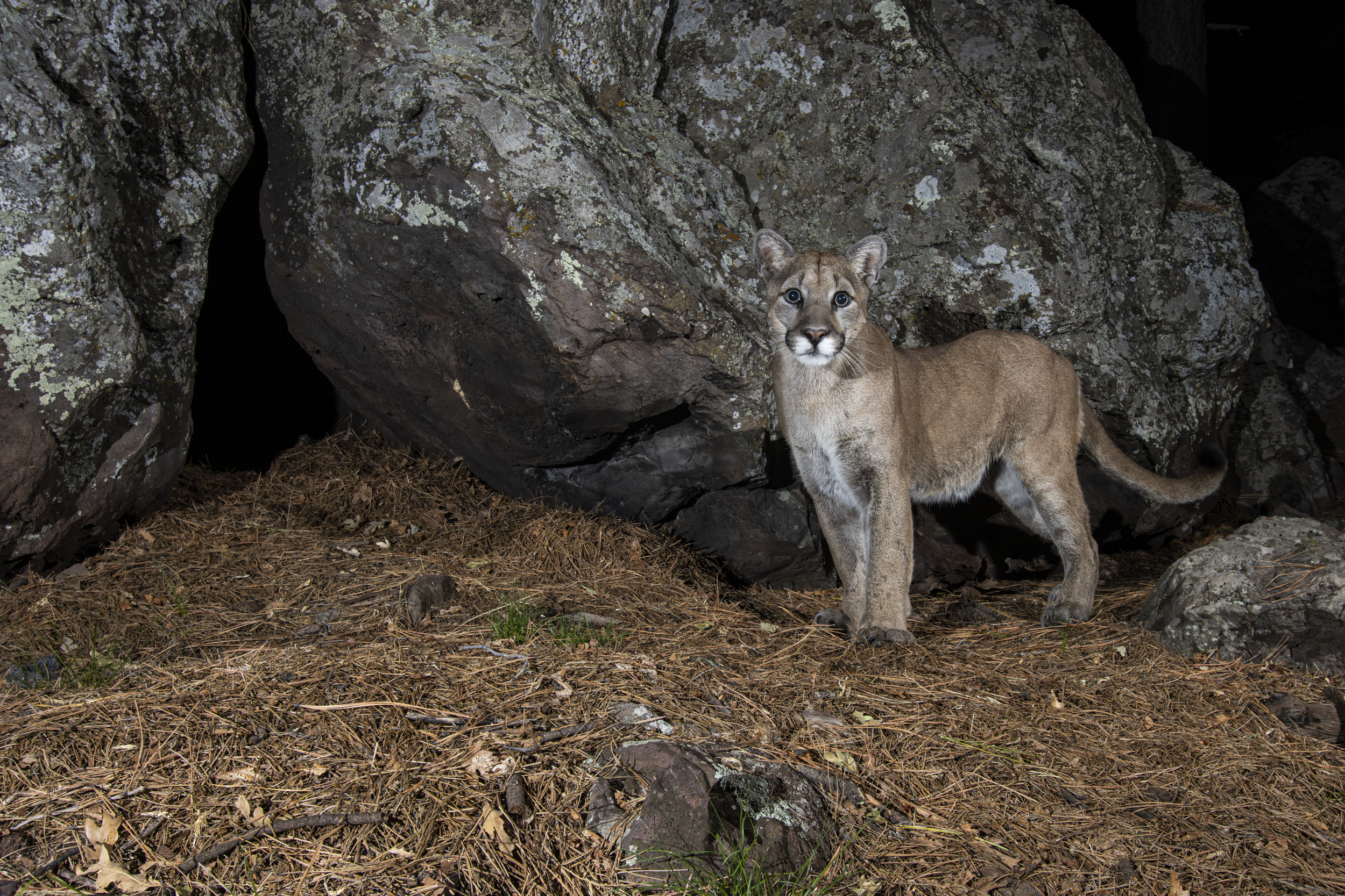 Mature, male Cougar, checking out a possible den.