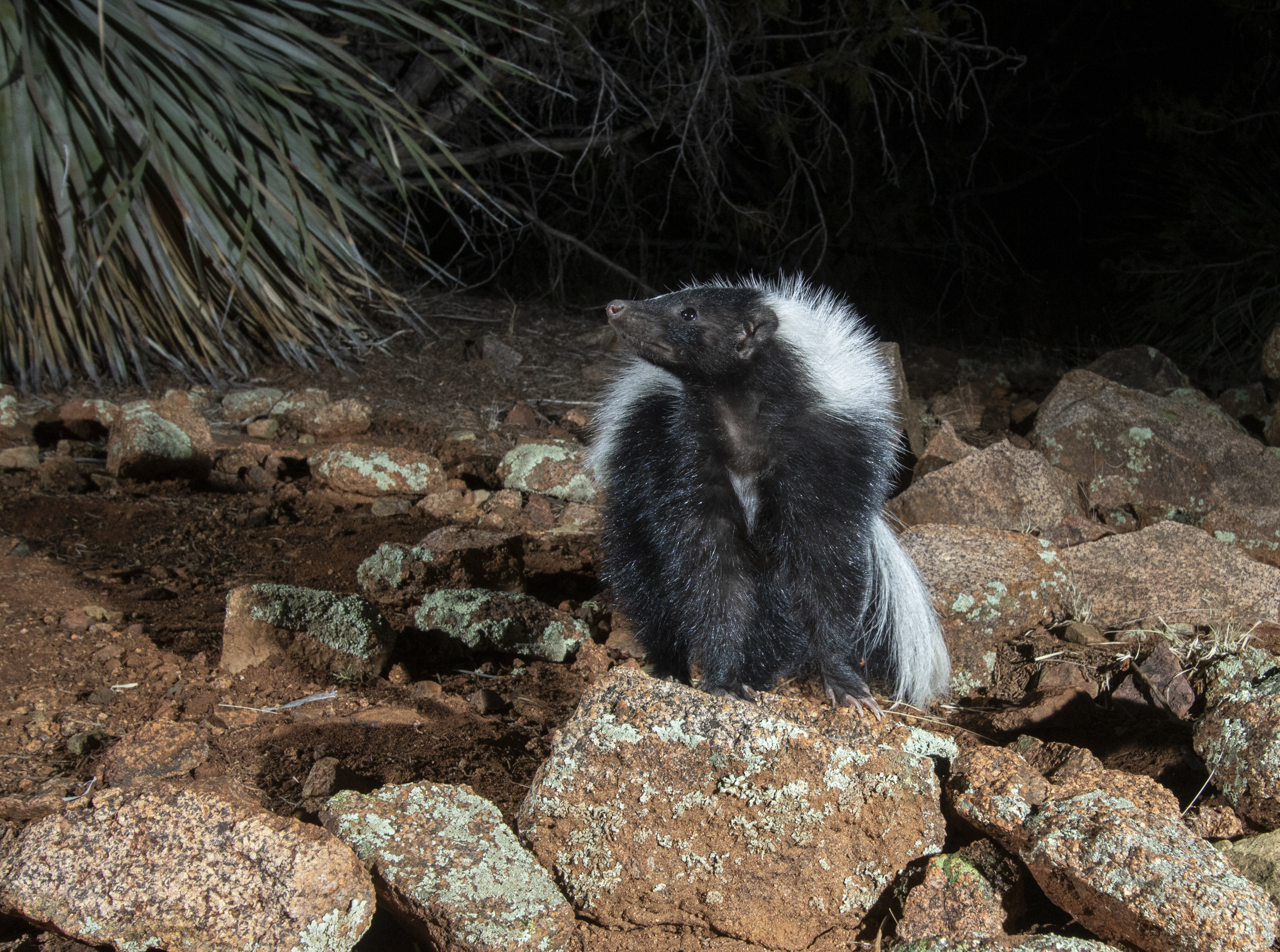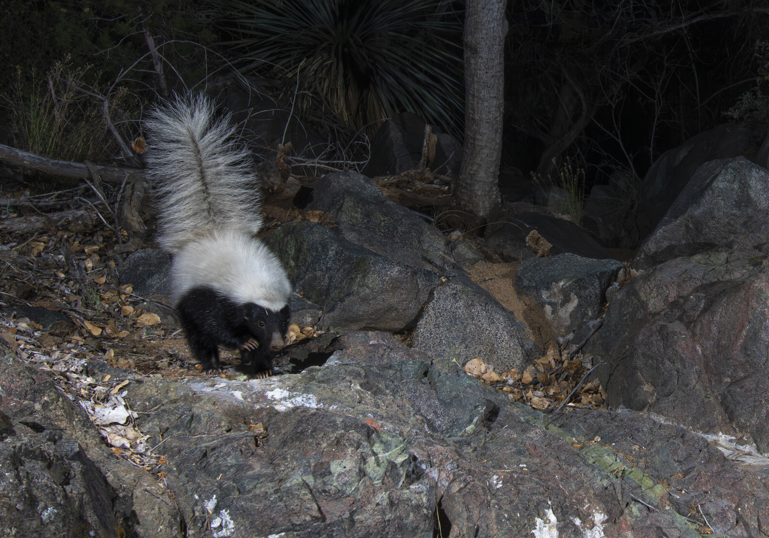 Hog-nosed skunk, strolling through a ravine.