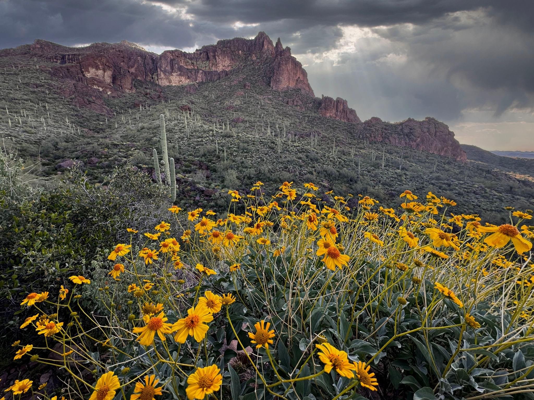 On the trail to Hieroglyphic Springs, the desert blooms defiantly beneath a gathering storm. Nature’s storyboard: wild marigolds, ancient stone, and a sky ready to speak.