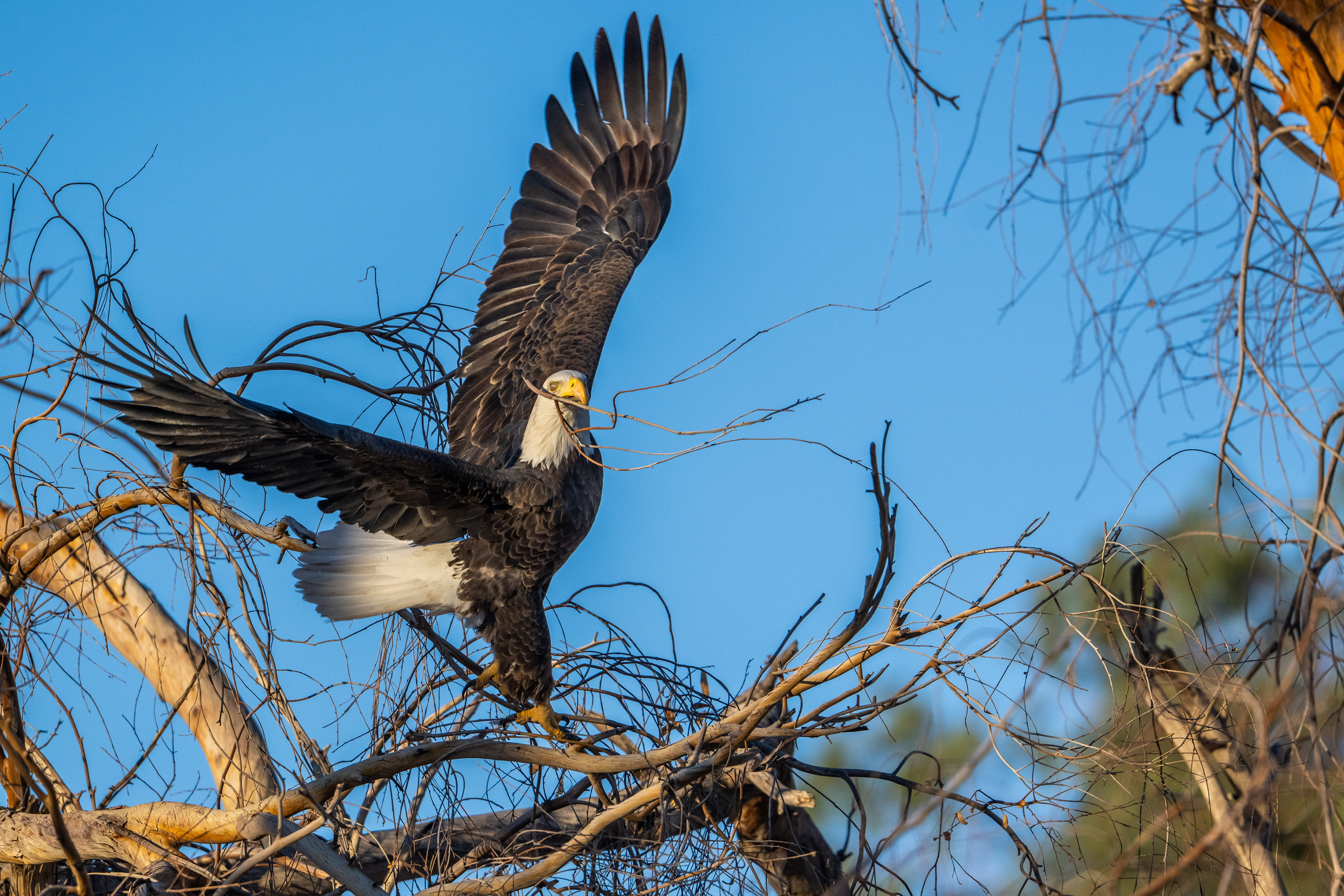 A female Bald Eagle gathering sticks for nesting material
