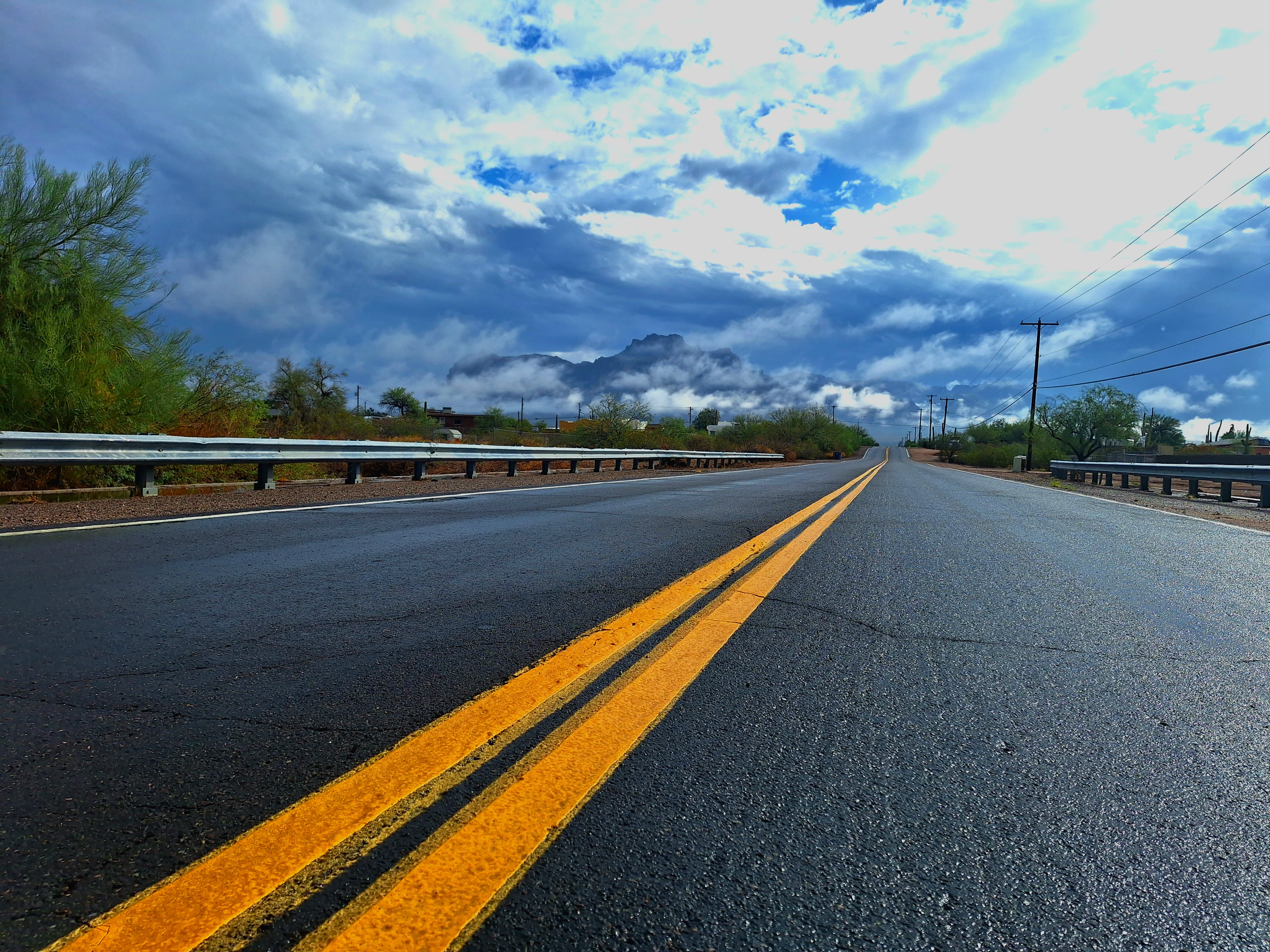 Shot of superstition mountains covered in heavy clouds and fog.