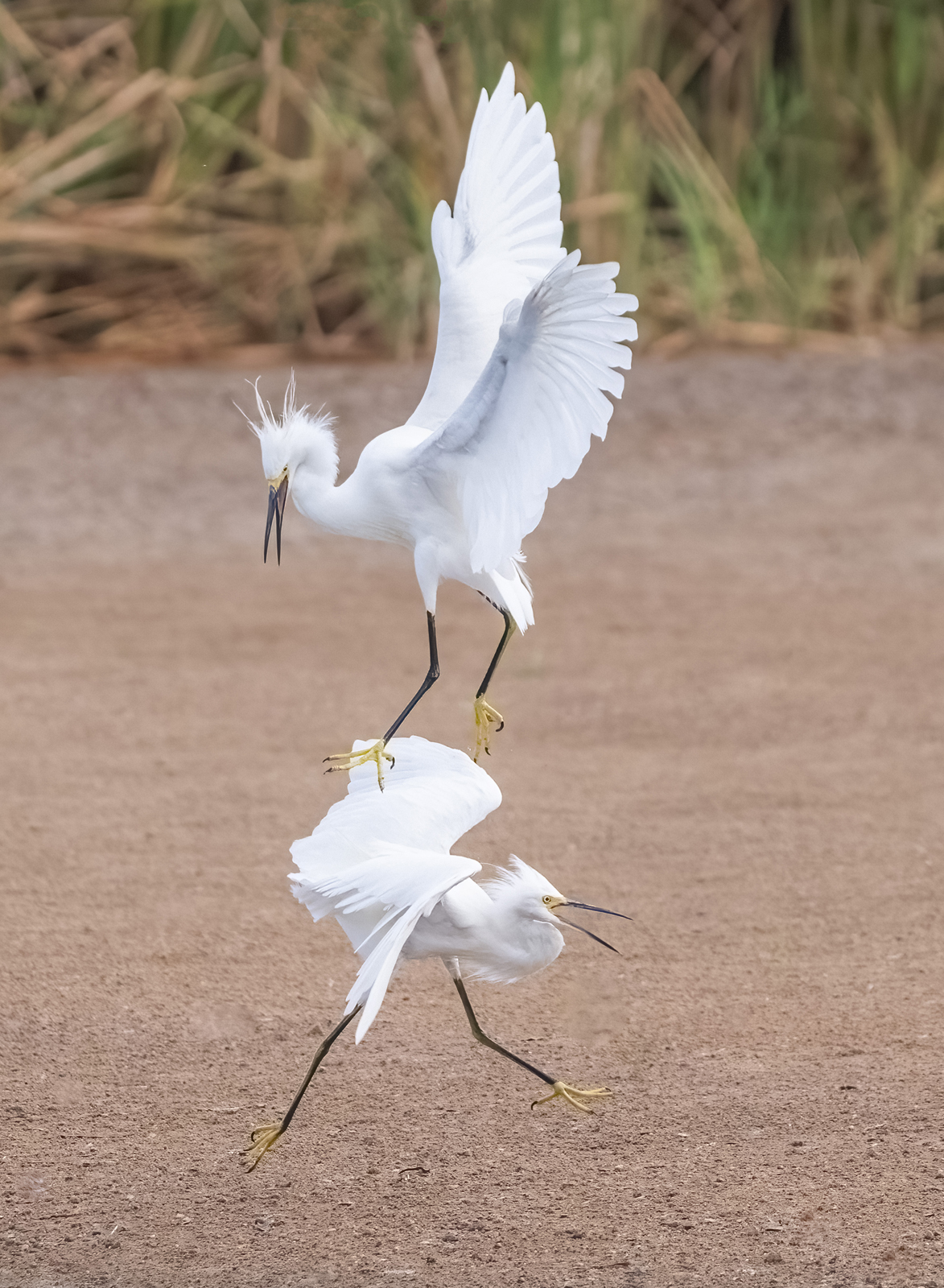Snowy Egrets can be highly aggressive toward each other. Sometimes, it is to scare away the other egret to take their fishing spot.
