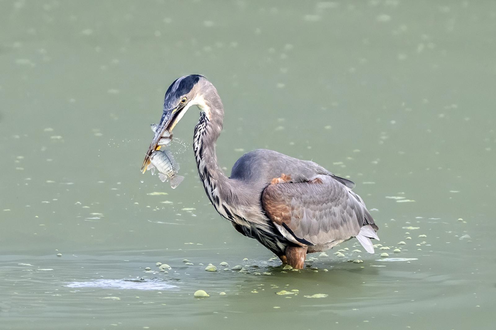 A Great Blue Heron catches 3 fish with one lunge of its beak into the pond.