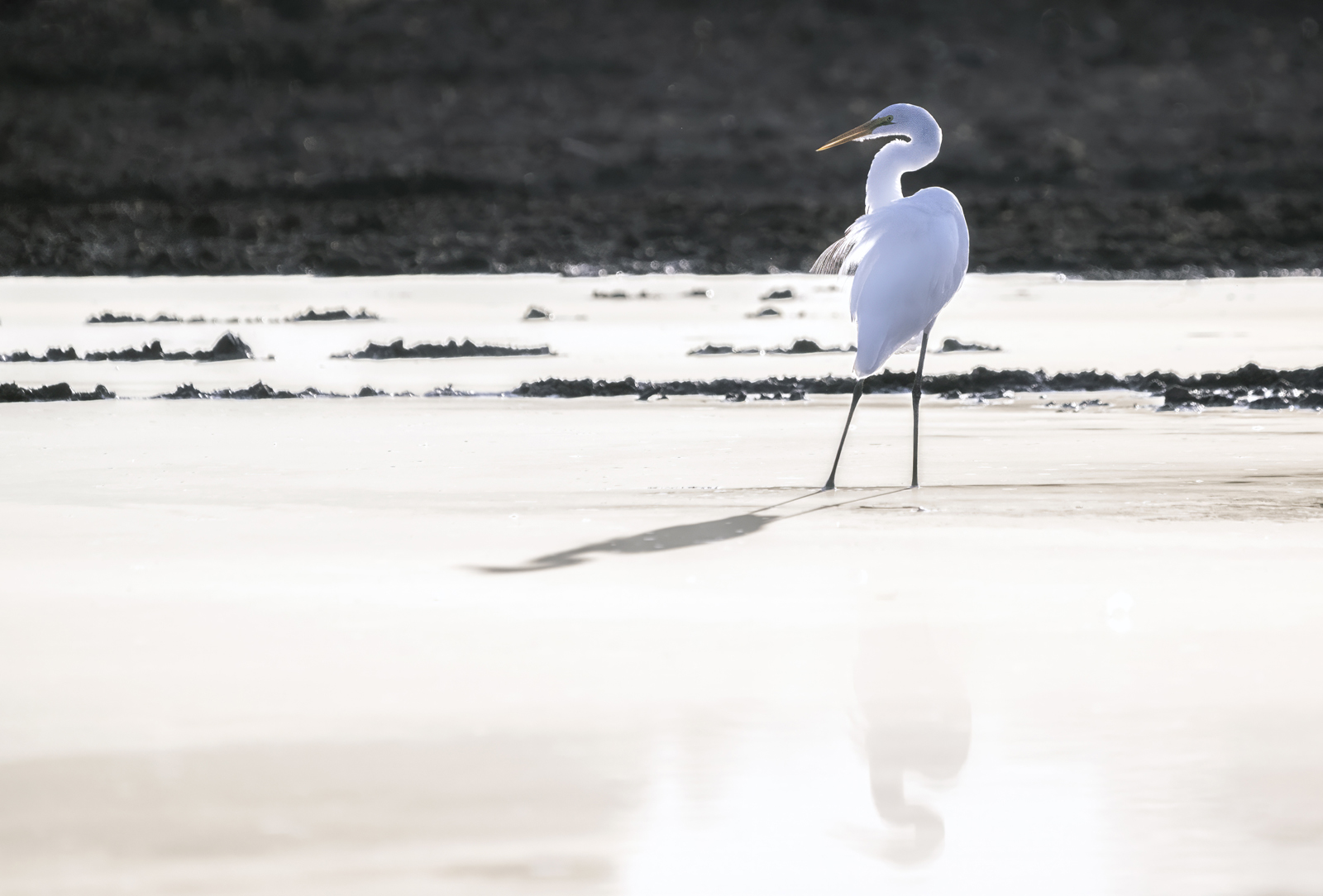 A Great Egret casts a shadow and a reflection on the pond. High-key image.