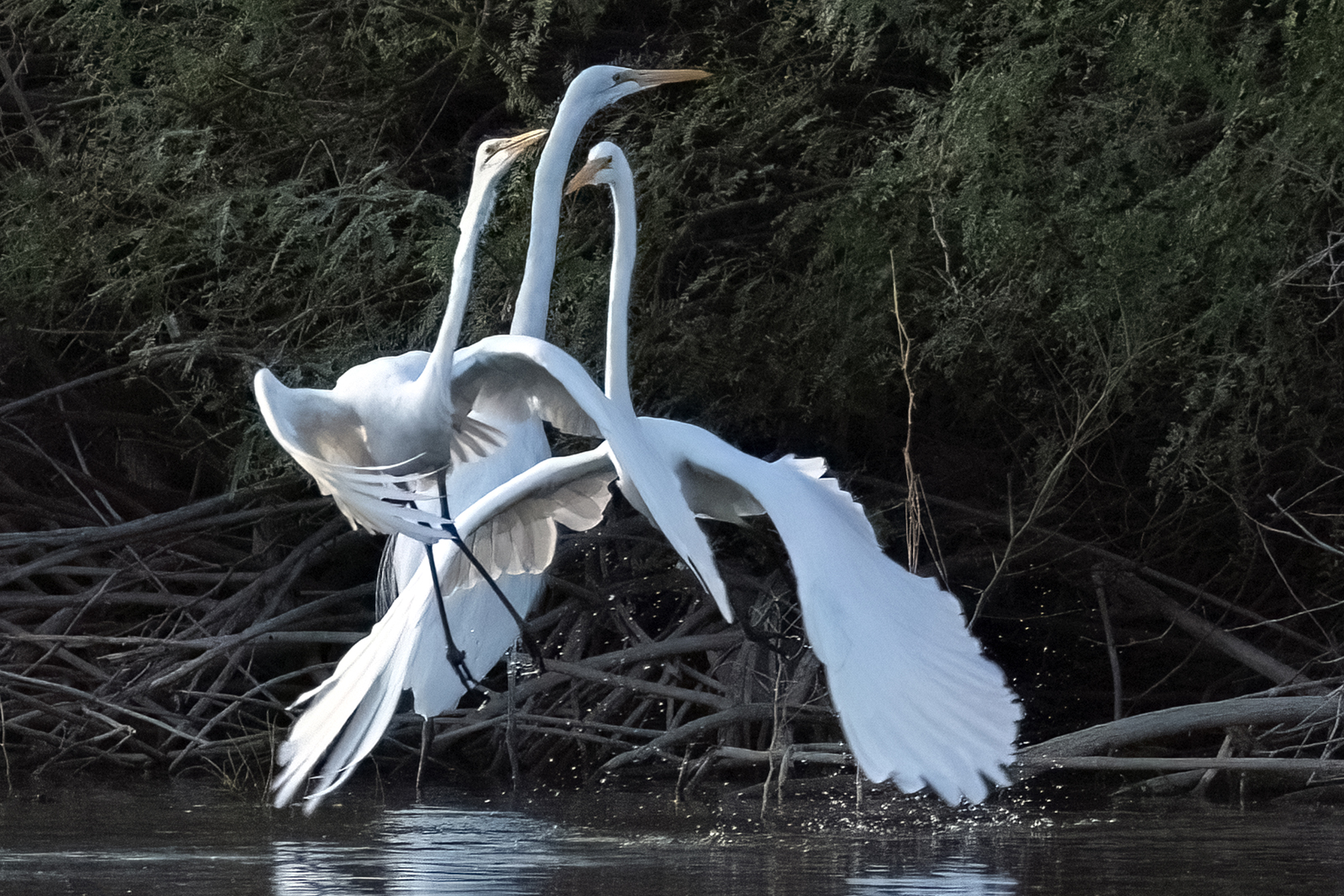 Great Egrets. The chase started when one of them invaded their fishing spot.