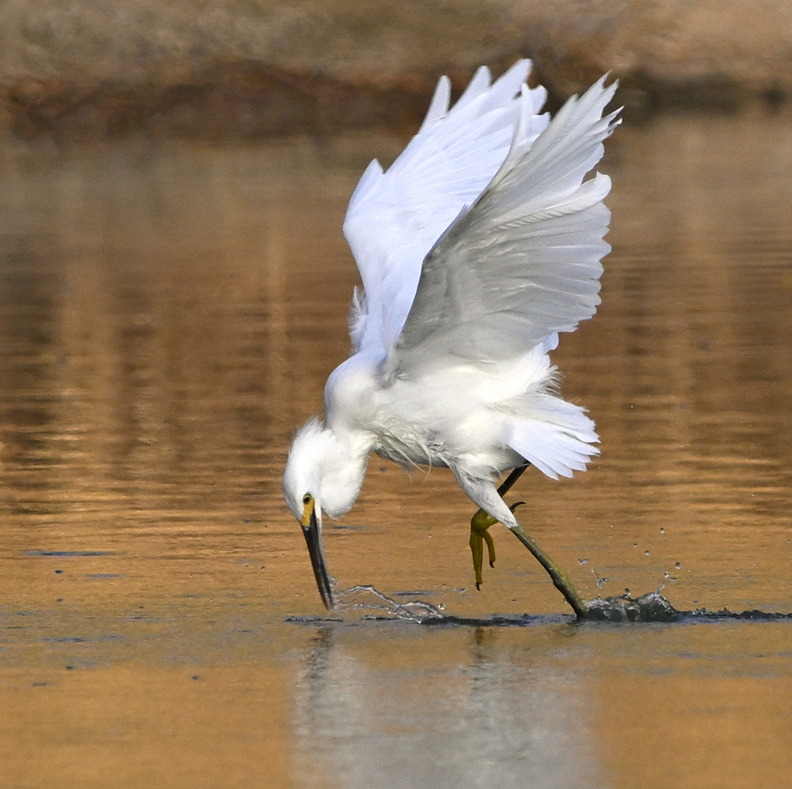 The Snowy Egrets use their yellow "feet" (Yellow Slippers) to feed in several different ways. They use them to stir up small fish as they slowly fly across the surface of the water.
