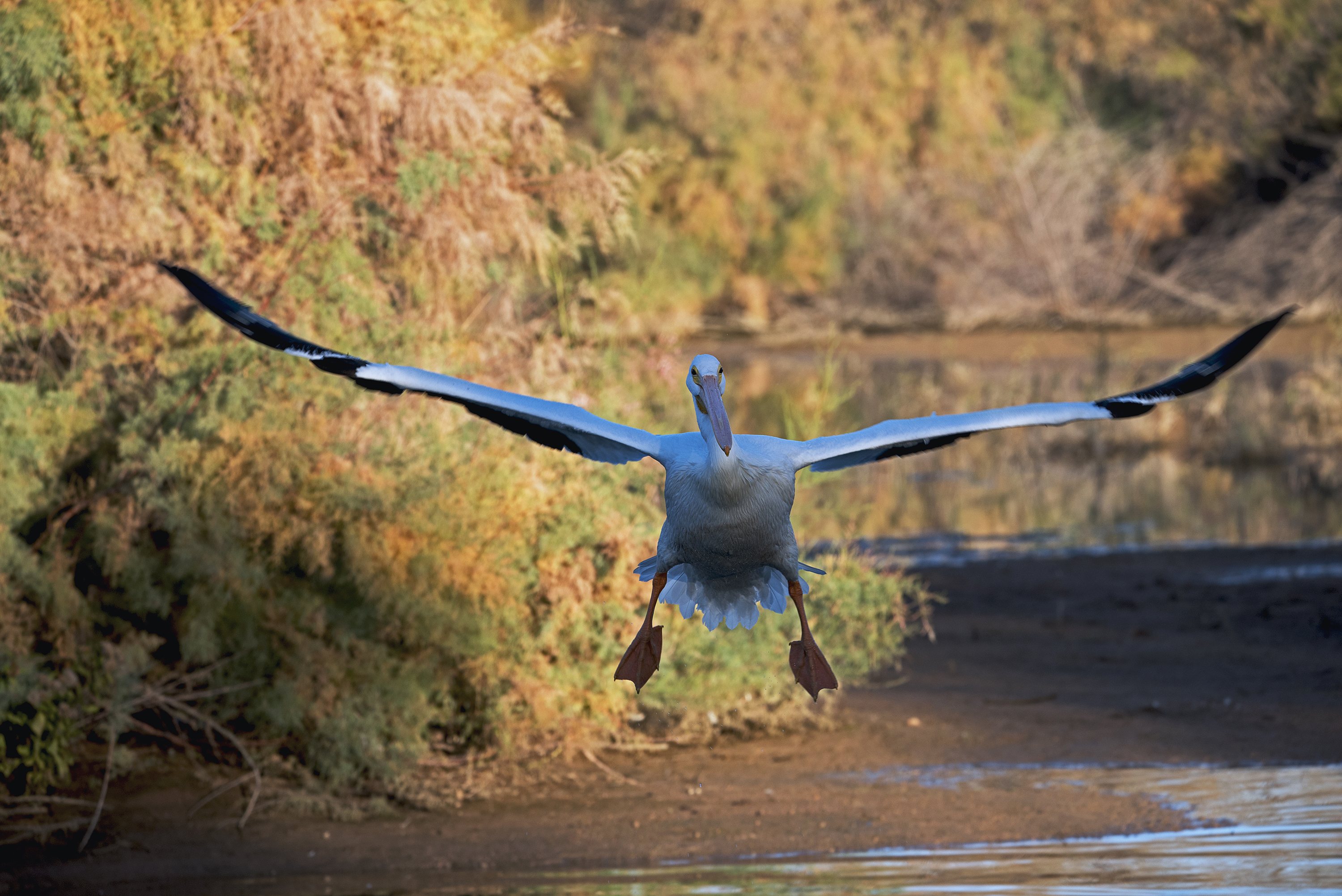 Pelican landing on Riparian Preserve water with its very wide wings spread.