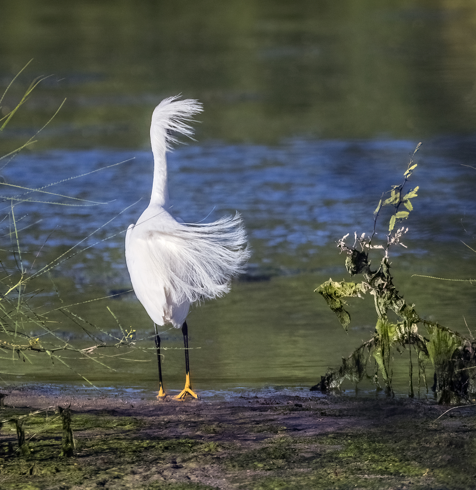 A Snowy Egret raises its head feathers in response to activity on the pond. Most likely, it was detecting another Snowy Egret heading in its direction.