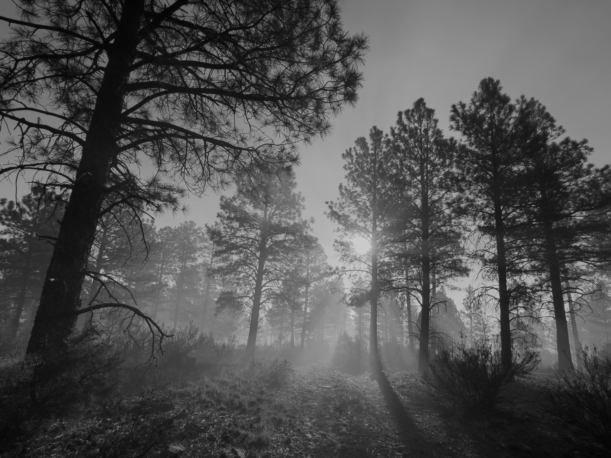 The sunrise shining through Sitgreaves National Forest during a prescribed burn.