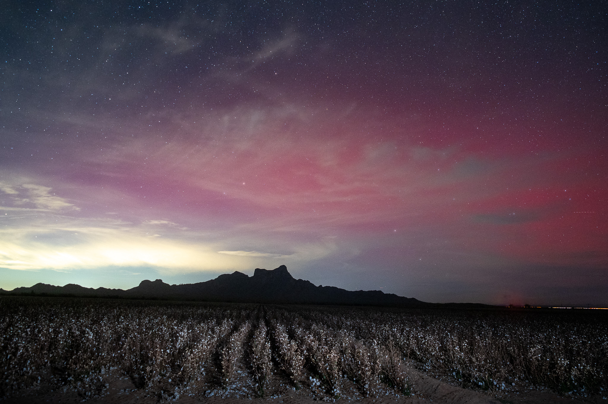 The aurora over the Marana cotton fields looking toward Picacho Peak, November 2025.