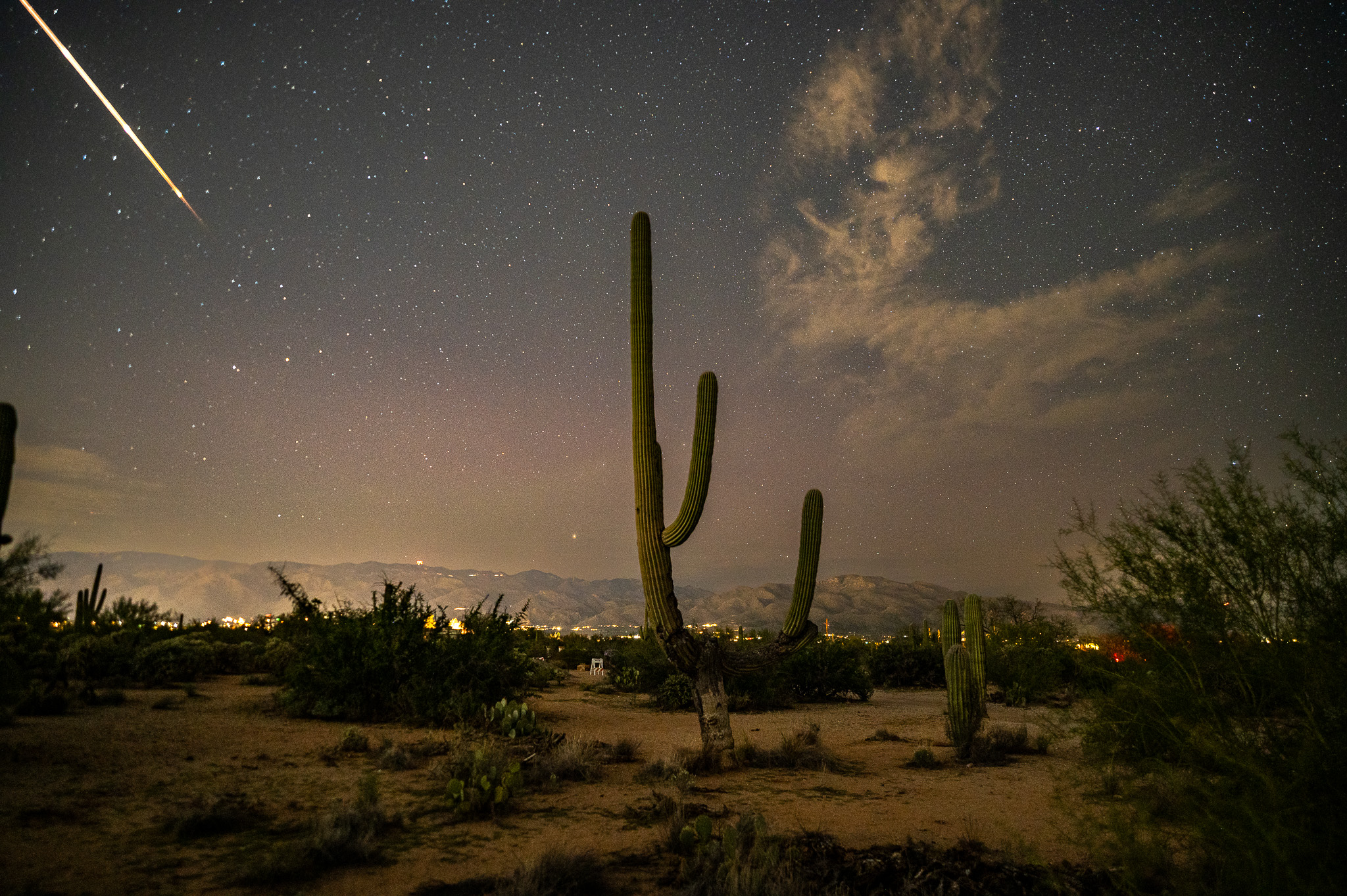 A hint of the aurora with a large meteor overhead in Saguaro National Park. The cloud in the sky mimics the ballerina saguaro.